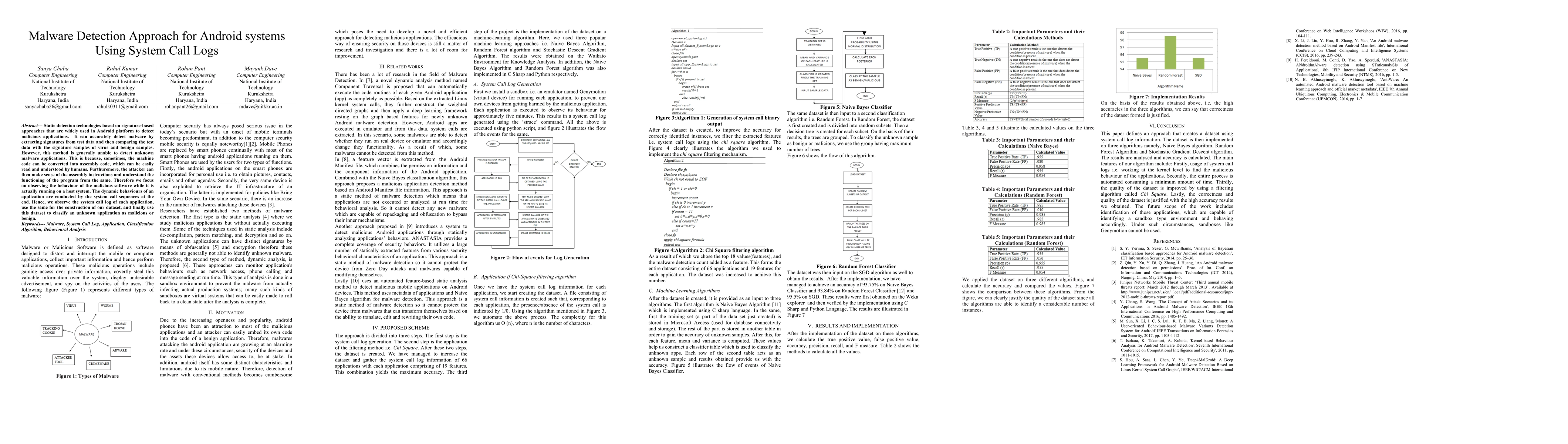 Static detection technologies based on signature-based approaches that are widely used in Android platform to detect malicious applications. It can accurately detect malware by extracting signatures from test data and then comparing the test data with the signature samples of virus and benign samples. However, this method is generally unable to detect unknown malware applications. This is because, sometimes, the machine code can be converted into assembly code, which can be easily read and understood by humans. Furthuremore, the attacker can then make sense of the assembly instructions and understand the functioning of the program from the same. Therefore we focus on observing the behaviour of the malicious software while it is actually running on a host system. The dynamic behaviours of an application are conducted by the system call sequences at the end. Hence, we observe the system call log of each application, use the same for the construction of our dataset, and finally use this dataset to classify an unknown application as malicious or benign.