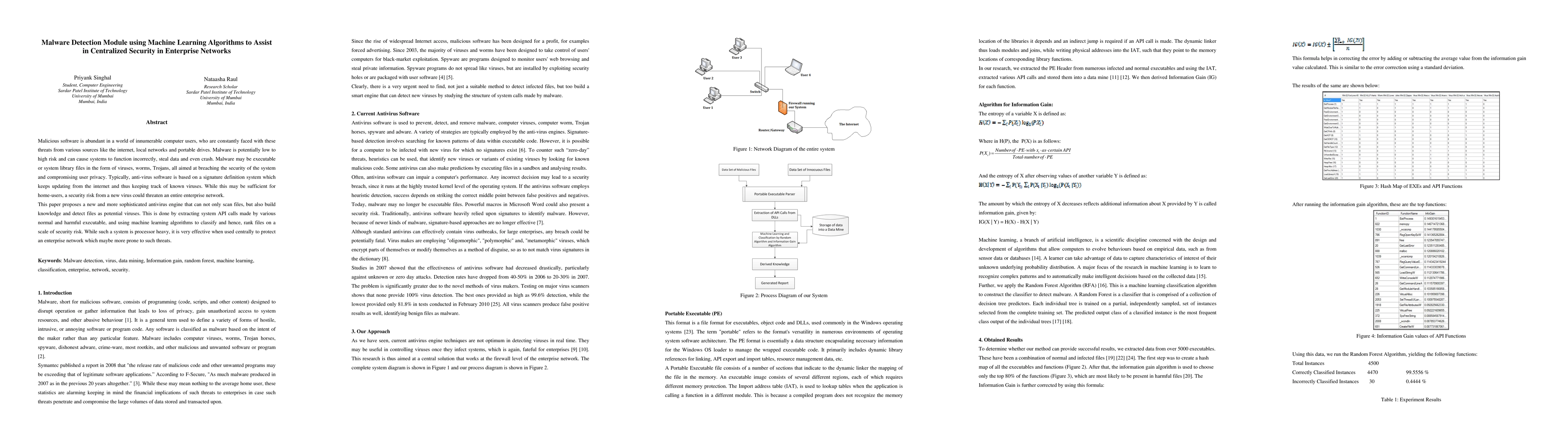 This paper proposes a sophisticated malware detection module using machine learning algorithms to enhance centralized security in enterprise networks. It extracts system API calls from executables and employs machine learning to classify and rank files based on security risk, offering a more effective solution than traditional signature-based antivirus software.
