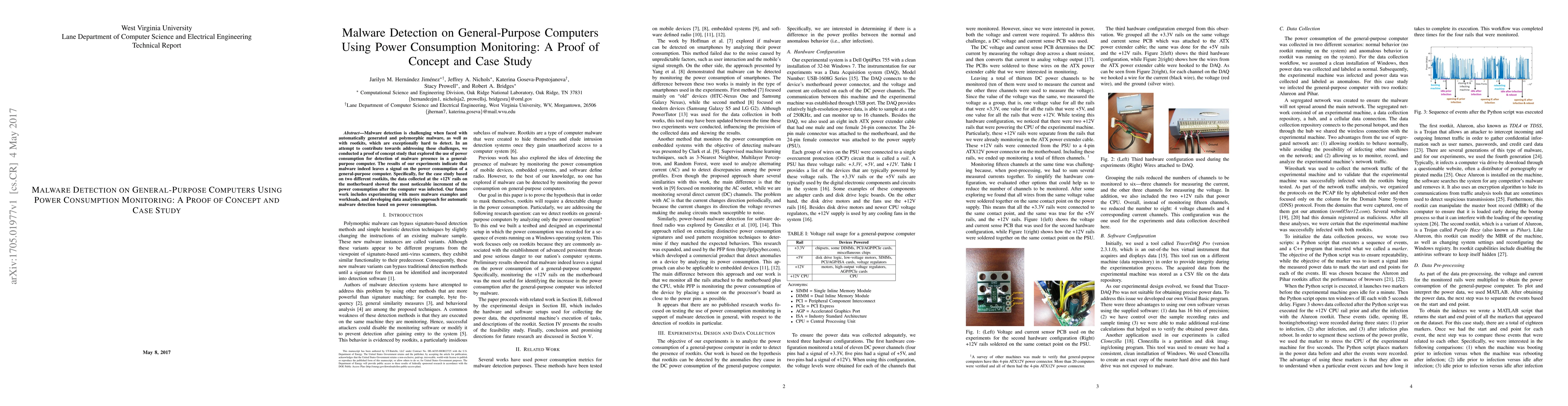 Researchers explored using power consumption to detect malware on general-purpose computers, finding that infected systems exhibit increased power usage, particularly at +12V rails.