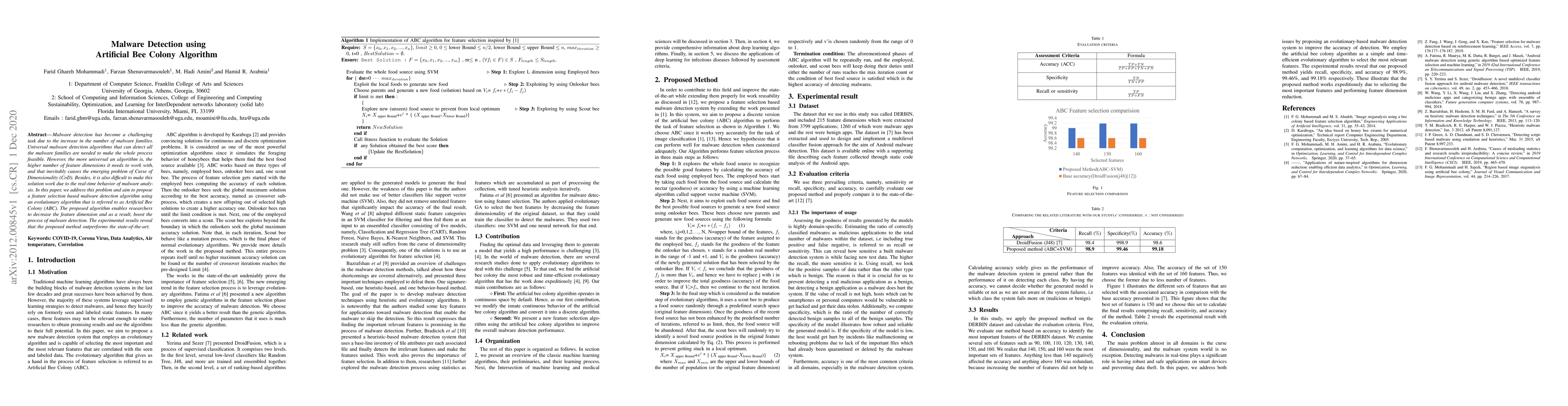 This paper proposes a feature selection-based malware detection algorithm using the Artificial Bee Colony (ABC) algorithm to address the Curse of Dimensionality and improve real-time detection efficiency. Experimental results show that the ABC-based method outperforms existing state-of-the-art techniques.