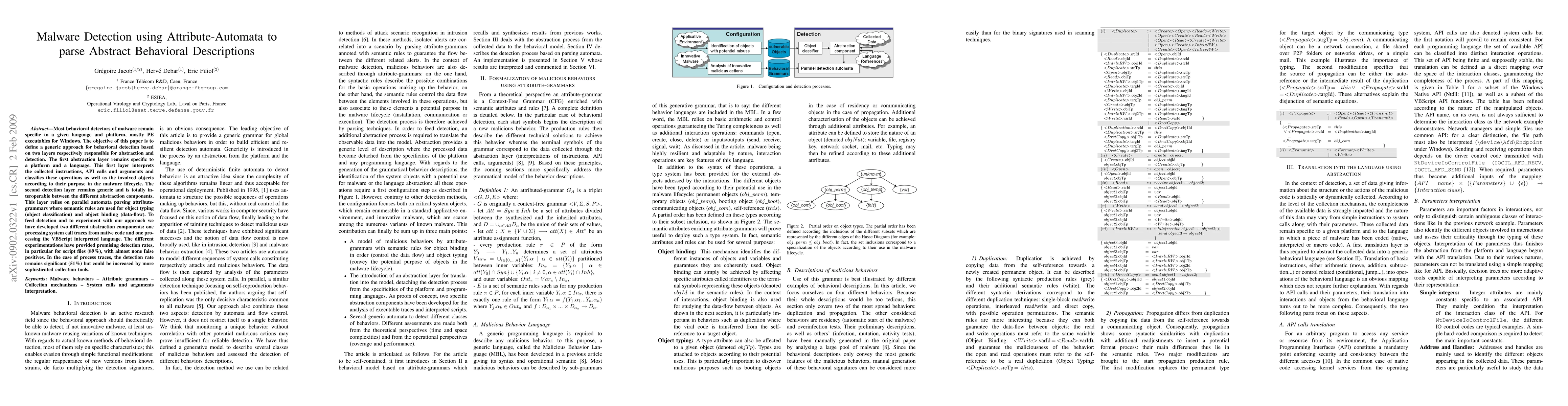 A new approach to malware detection uses attribute-automata to parse abstract behavioral descriptions, with promising results for script files (89% detection rate) and process traces.