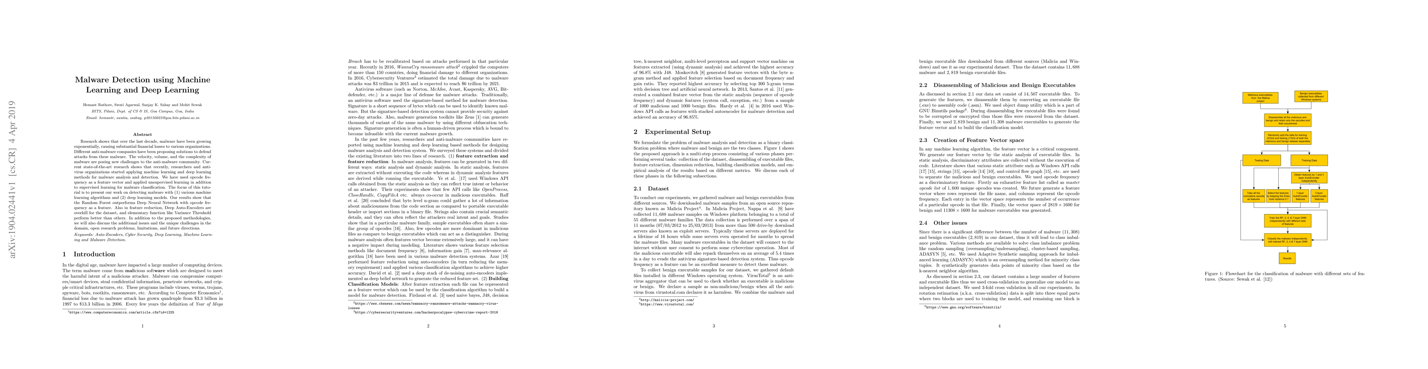 Research shows that over the last decade, malware has been growing exponentially, causing substantial financial losses to various organizations. Different anti-malware companies have been proposing solutions to defend attacks from these malware. The velocity, volume, and the complexity of malware are posing new challenges to the anti-malware community. Current state-of-the-art research shows that recently, researchers and anti-virus organizations started applying machine learning and deep learning methods for malware analysis and detection. We have used opcode frequency as a feature vector and applied unsupervised learning in addition to supervised learning for malware classification. The focus of this tutorial is to present our work on detecting malware with 1) various machine learning algorithms and 2) deep learning models. Our results show that the Random Forest outperforms Deep Neural Network with opcode frequency as a feature. Also in feature reduction, Deep Auto-Encoders are overkill for the dataset, and elementary function like Variance Threshold perform better than others. In addition to the proposed methodologies, we will also discuss the additional issues and the unique challenges in the domain, open research problems, limitations, and future directions.