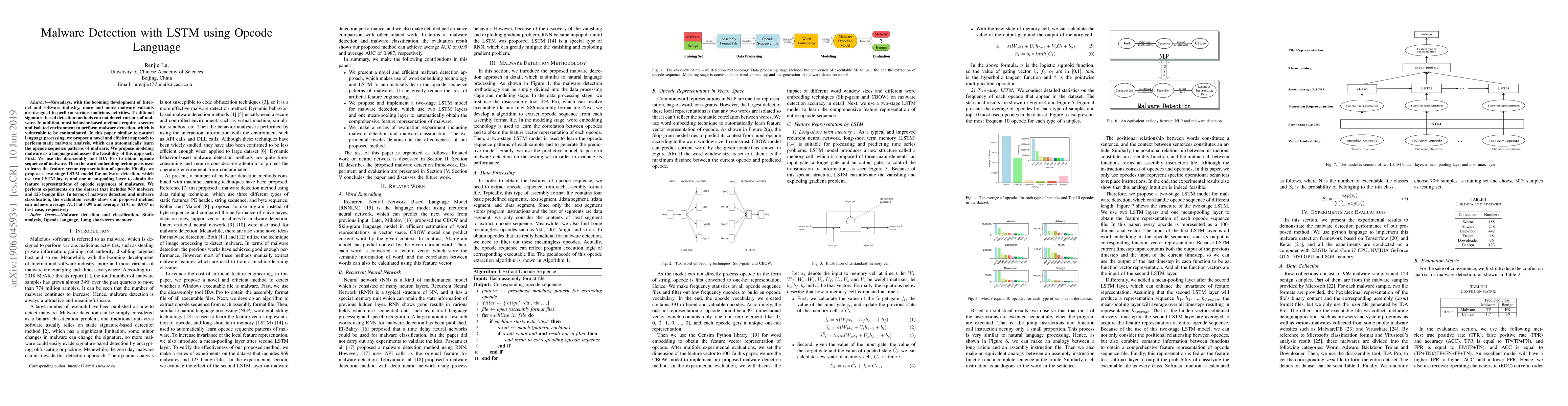 This paper proposes a novel LSTM-based approach for static malware detection by modeling malware as a language and analyzing its opcode sequences. The method uses IDA Pro for disassembly, word embedding for feature representation, and a two-stage LSTM model for detection, achieving high AUC scores in experiments.