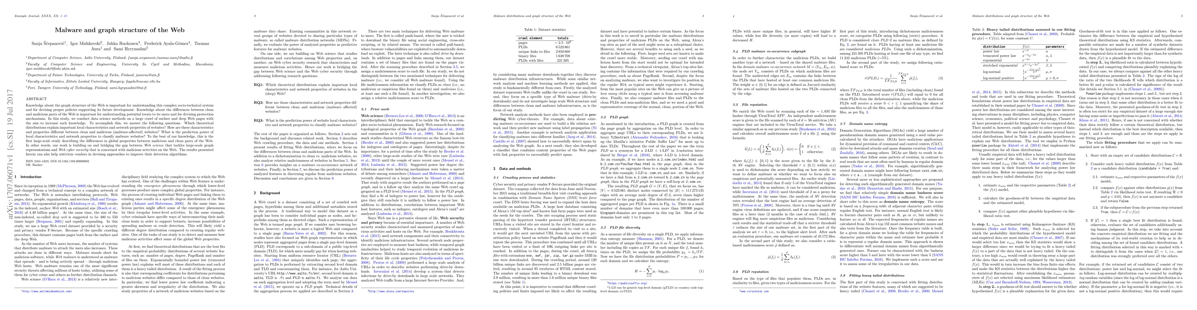 Knowledge about the graph structure of the Web is important for understanding this complex socio-technical system and for devising proper policies supporting its future development. Knowledge about the differences between clean and malicious parts of the Web is important for understanding potential treats to its users and for devising protection mechanisms. In this study, we conduct data science methods on a large crawl of surface and deep Web pages with the aim to increase such knowledge. To accomplish this, we answer the following questions. Which theoretical distributions explain important local characteristics and network properties of websites? How are these characteristics and properties different between clean and malicious (malware-affected) websites? What is the prediction power of local characteristics and network properties to classify malware websites? To the best of our knowledge, this is the first large-scale study describing the differences in global properties between malicious and clean parts of the Web. In other words, our work is building on and bridging the gap between \textit{Web science} that tackles large-scale graph representations and \textit{Web cyber security} that is concerned with malicious activities on the Web. The results presented herein can also help antivirus vendors in devising approaches to improve their detection algorithms.