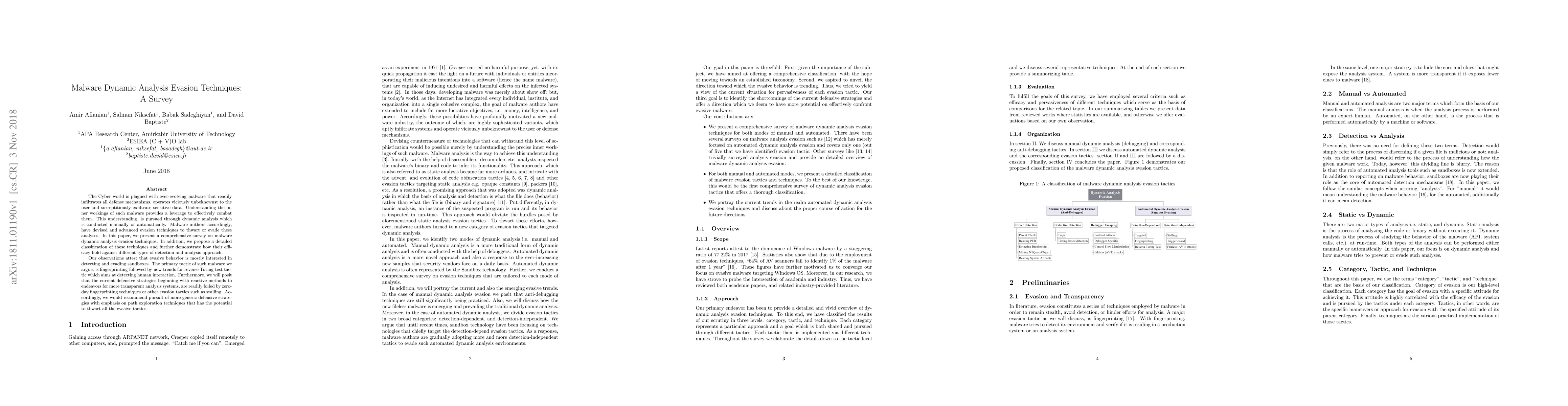 This paper surveys malware dynamic analysis evasion techniques, classifying them into fingerprinting, reverse Turing tests, and stalling tactics. It argues that current defensive strategies are often ineffective against zero-day evasion methods, recommending a shift towards more generic, path exploration-based defensive strategies.