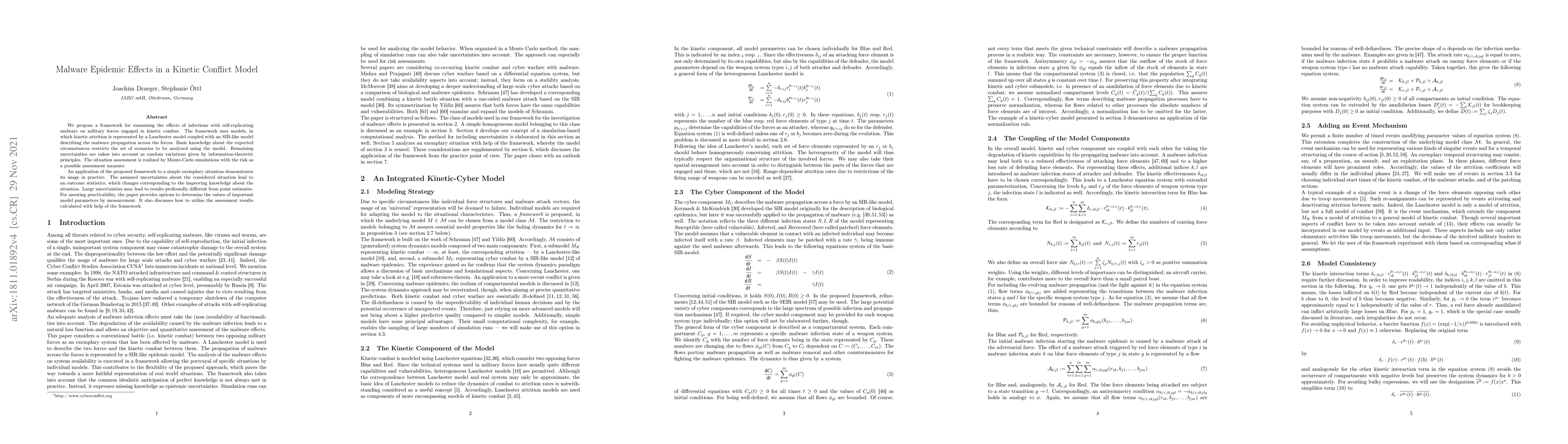 We propose a framework for examining the effects of infections with self-replicating malware on military forces engaged in kinetic combat. The framework uses models, in which kinetic attrition is represented by a Lanchester model coupled with an SIR-like model describing the malware propagation across the forces. Basic knowledge about the expected circumstances restricts the set of scenarios to be analyzed using the model. Remaining uncertainties are taken into account as random variations given by information-theoretic principles. The situation assessment is realized by Monte-Carlo simulations with the risk as a possible assessment measure. An application of the proposed framework to a simple exemplary situation demonstrates its usage in practice. The assumed uncertainties about the considered situation lead to an outcome statistics, which changes corresponding to the improving knowledge about the situation. Large uncertainties may lead to results profoundly different from point estimates. For assuring practicability, the paper provides options to determine the values of important model parameters by measurement. It also discusses how to utilize the assessment results calculated with help of the framework.
