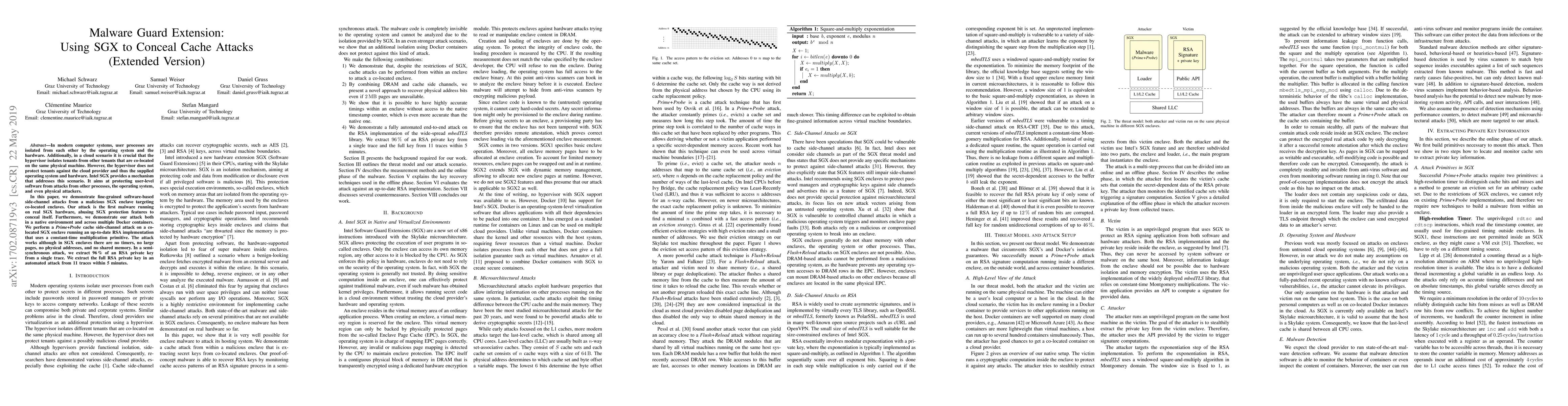 This paper explores the vulnerabilities of Intel SGX enclaves to cache side-channel attacks, demonstrating a novel attack that targets co-located SGX enclaves. The attack successfully extracts RSA private keys despite the absence of traditional attack vectors, highlighting significant security risks in cloud-based SGX implementations.
