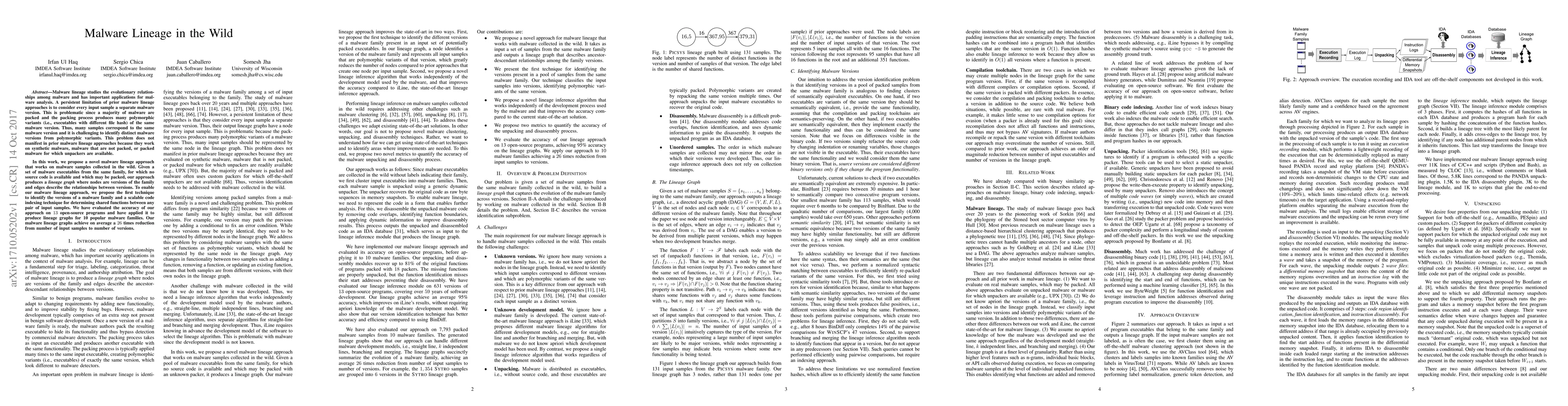 This paper proposes a novel approach for constructing malware lineage graphs from polymorphic variants found in the wild, addressing the issue of packed malware that generates many different hashes for the same version. The method identifies malware versions and shared functions, achieving a 26 times reduction in the number of versions from input samples, validated on 13 open-source programs and 10 popular malware families.
