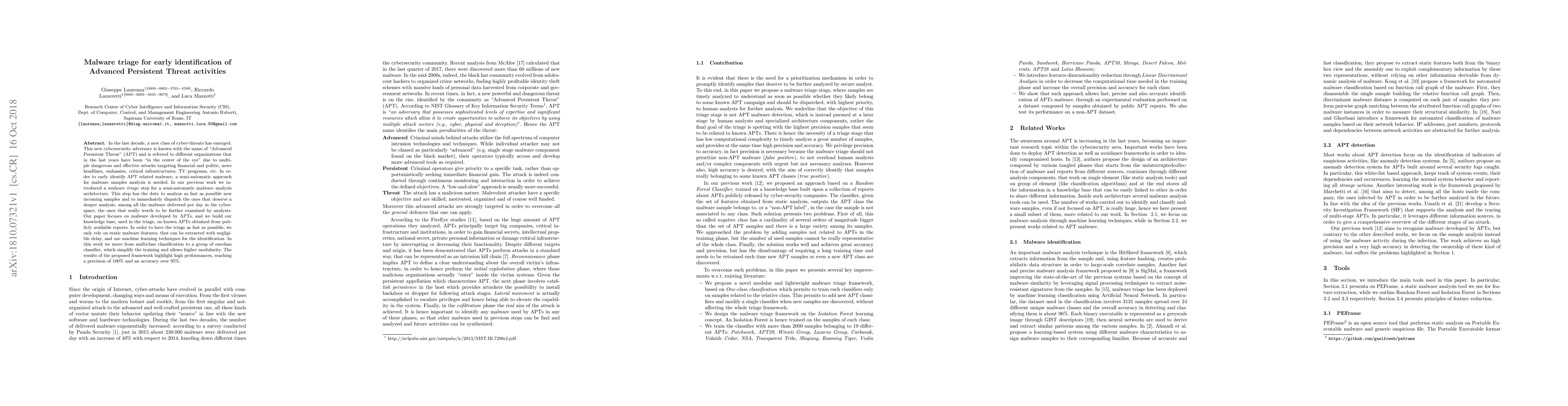 In the last decade, a new class of cyber-threats has emerged. This new cybersecurity adversary is known with the name of "Advanced Persistent Threat" (APT) and is referred to different organizations that in the last years have been "in the center of the eye" due to multiple dangerous and effective attacks targeting financial and politic, news headlines, embassies, critical infrastructures, TV programs, etc. In order to early identify APT related malware, a semi-automatic approach for malware samples analysis is needed. In our previous work we introduced a "malware triage" step for a semi-automatic malware analysis architecture. This step has the duty to analyze as fast as possible new incoming samples and to immediately dispatch the ones that deserve a deeper analysis, among all the malware delivered per day in the cyber-space, the ones that really worth to be further examined by analysts. Our paper focuses on malware developed by APTs, and we build our knowledge base, used in the triage, on known APTs obtained from publicly available reports. In order to have the triage as fast as possible, we only rely on static malware features, that can be extracted with negligible delay, and use machine learning techniques for the identification. In this work we move from multiclass classification to a group of oneclass classifier, which simplify the training and allows higher modularity. The results of the proposed framework highlight high performances, reaching a precision of 100% and an accuracy over 95%