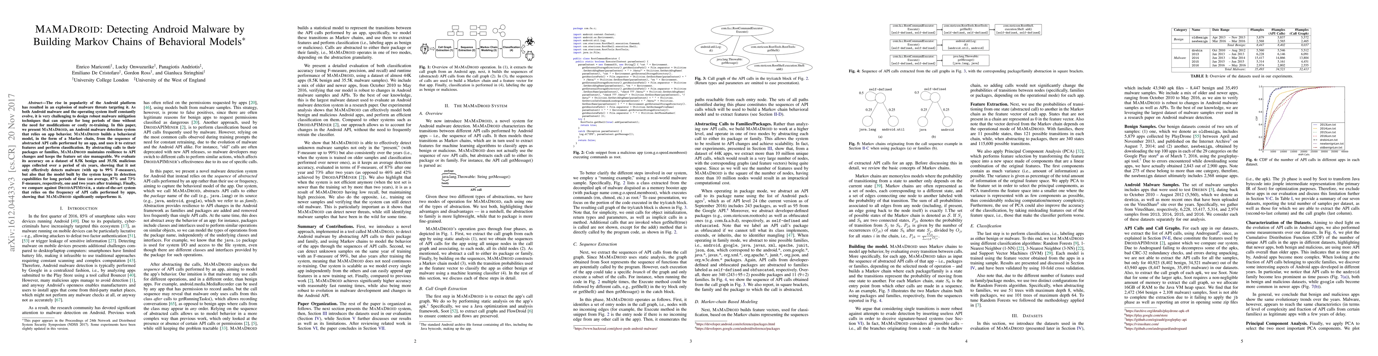 MaMaDroid is an Android malware detection system that constructs behavioral models using Markov chains from abstracted API call sequences. It demonstrates high detection accuracy and maintains effectiveness over long periods, outperforming existing methods.