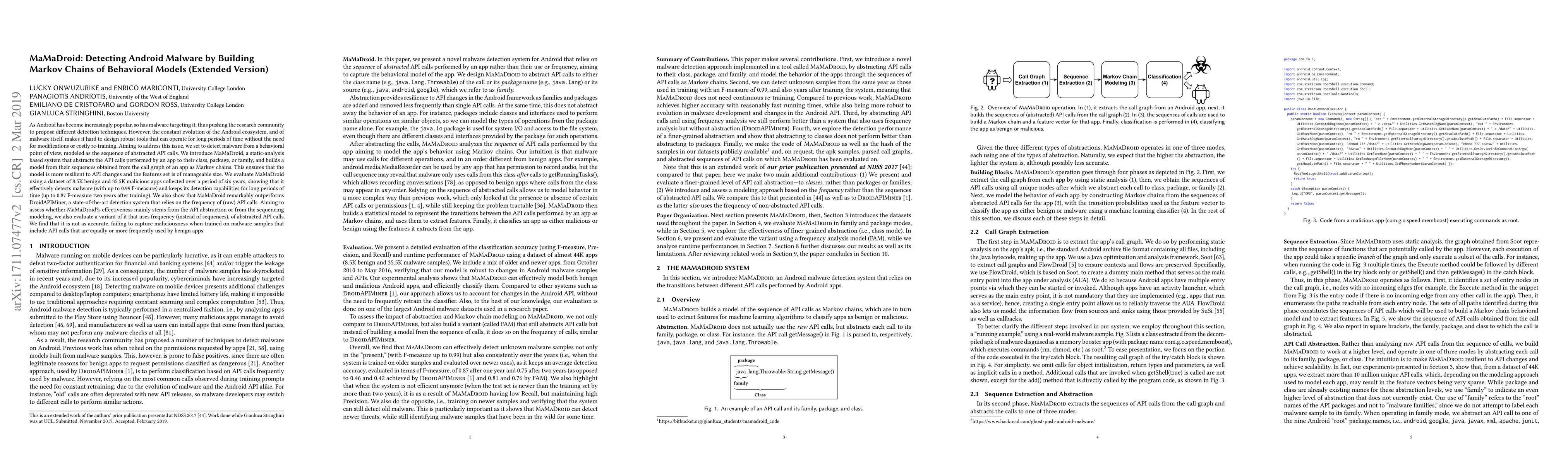 MaMaDroid employs Markov chains of abstracted API calls to detect Android malware, demonstrating high detection accuracy and resilience over time. The system's performance surpasses that of DroidAPIMiner, highlighting the effectiveness of behavioral modeling over raw API frequency.