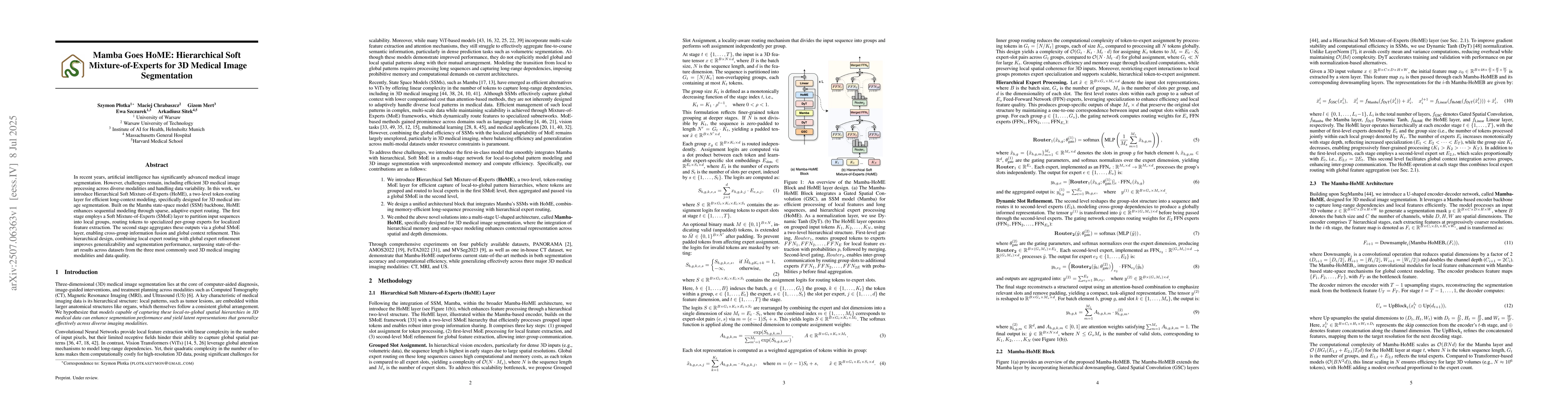 In recent years, artificial intelligence has significantly advanced medical image segmentation. However, challenges remain, including efficient 3D medical image processing across diverse modalities and handling data variability. In this work, we introduce Hierarchical Soft Mixture-of-Experts (HoME), a two-level token-routing layer for efficient long-context modeling, specifically designed for 3D medical image segmentation. Built on the Mamba state-space model (SSM) backbone, HoME enhances sequential modeling through sparse, adaptive expert routing. The first stage employs a Soft Mixture-of-Experts (SMoE) layer to partition input sequences into local groups, routing tokens to specialized per-group experts for localized feature extraction. The second stage aggregates these outputs via a global SMoE layer, enabling cross-group information fusion and global context refinement. This hierarchical design, combining local expert routing with global expert refinement improves generalizability and segmentation performance, surpassing state-of-the-art results across datasets from the three most commonly used 3D medical imaging modalities and data quality.