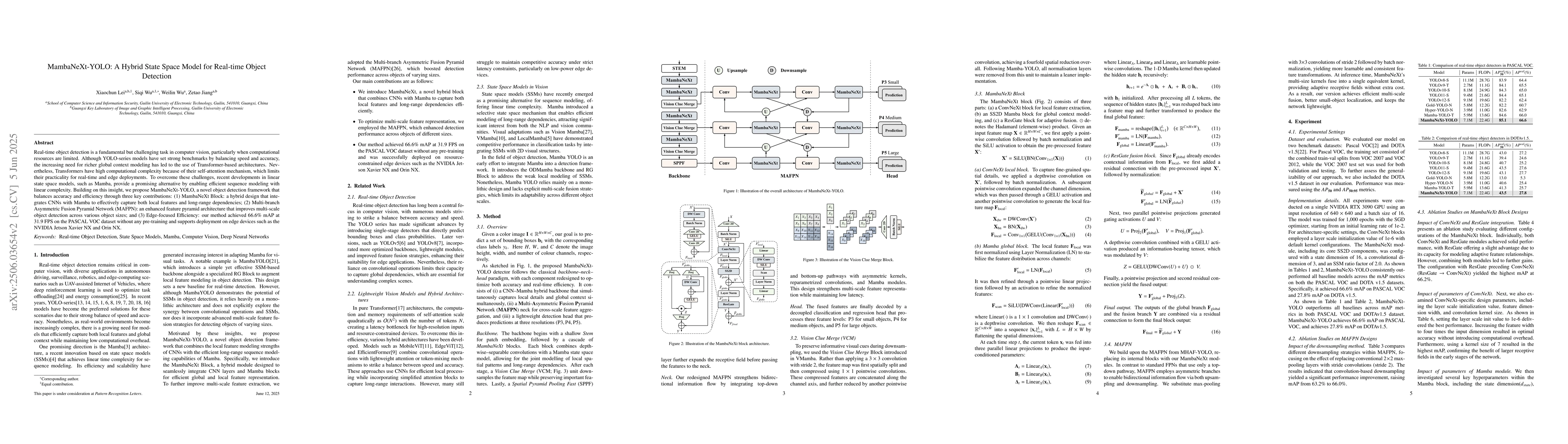 The main technical contribution is the MambaNeXt Block, a hybrid design that combines CNNs with Mamba for efficient sequence modeling, and the Multi-branch Asymmetric Fusion Pyramid Network (MAFPN) for improved multi-scale object detection.