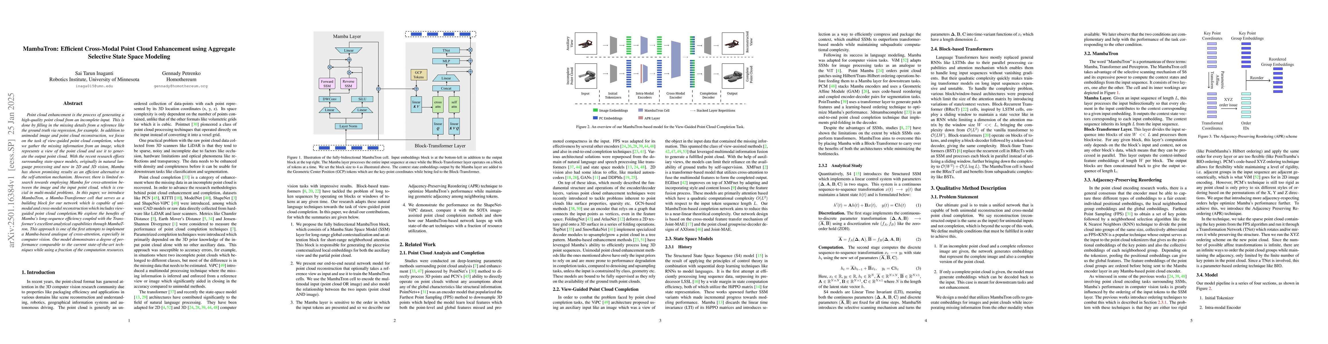 MambaTron is a novel Mamba-Transformer cell designed for efficient cross-modal point cloud enhancement by leveraging aggregate selective state space modeling. It combines Mamba's efficiency with cross-modal attention for view-guided point cloud completion, achieving state-of-the-art performance with lower computational costs.