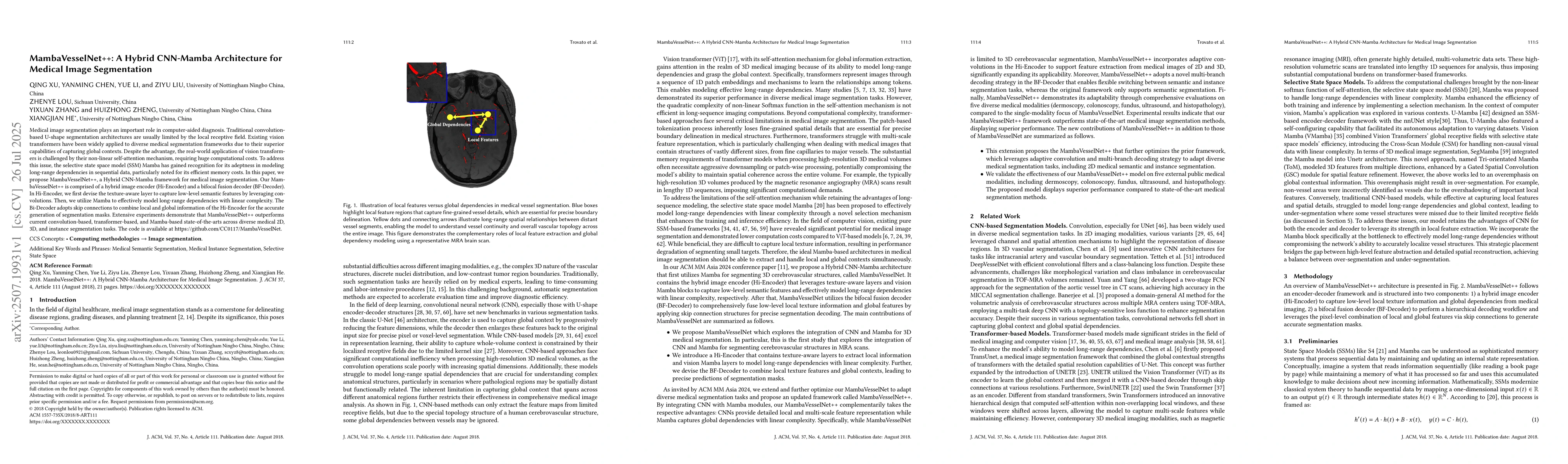 Medical image segmentation plays an important role in computer-aided diagnosis. Traditional convolution-based U-shape segmentation architectures are usually limited by the local receptive field. Existing vision transformers have been widely applied to diverse medical segmentation frameworks due to their superior capabilities of capturing global contexts. Despite the advantage, the real-world application of vision transformers is challenged by their non-linear self-attention mechanism, requiring huge computational costs. To address this issue, the selective state space model (SSM) Mamba has gained recognition for its adeptness in modeling long-range dependencies in sequential data, particularly noted for its efficient memory costs. In this paper, we propose MambaVesselNet++, a Hybrid CNN-Mamba framework for medical image segmentation. Our MambaVesselNet++ is comprised of a hybrid image encoder (Hi-Encoder) and a bifocal fusion decoder (BF-Decoder). In Hi-Encoder, we first devise the texture-aware layer to capture low-level semantic features by leveraging convolutions. Then, we utilize Mamba to effectively model long-range dependencies with linear complexity. The Bi-Decoder adopts skip connections to combine local and global information of the Hi-Encoder for the accurate generation of segmentation masks. Extensive experiments demonstrate that MambaVesselNet++ outperforms current convolution-based, transformer-based, and Mamba-based state-of-the-arts across diverse medical 2D, 3D, and instance segmentation tasks. The code is available at https://github.com/CC0117/MambaVesselNet.