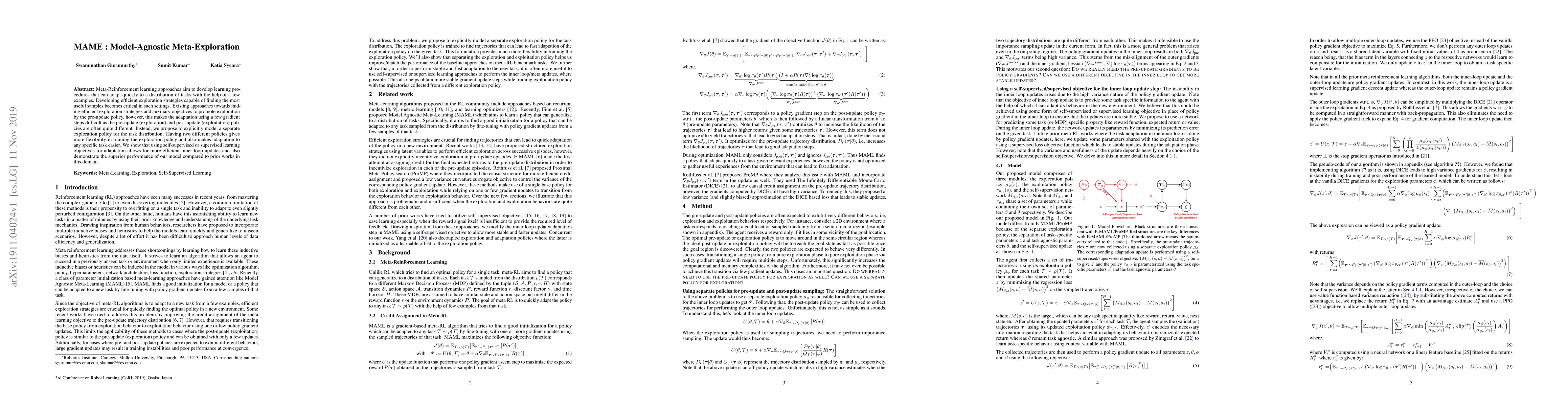 Meta-Reinforcement learning approaches aim to develop learning procedures that can adapt quickly to a distribution of tasks with the help of a few examples. Developing efficient exploration strategies capable of finding the most useful samples becomes critical in such settings. Existing approaches towards finding efficient exploration strategies add auxiliary objectives to promote exploration by the pre-update policy, however, this makes the adaptation using a few gradient steps difficult as the pre-update (exploration) and post-update (exploitation) policies are often quite different. Instead, we propose to explicitly model a separate exploration policy for the task distribution. Having two different policies gives more flexibility in training the exploration policy and also makes adaptation to any specific task easier. We show that using self-supervised or supervised learning objectives for adaptation allows for more efficient inner-loop updates and also demonstrate the superior performance of our model compared to prior works in this domain.
