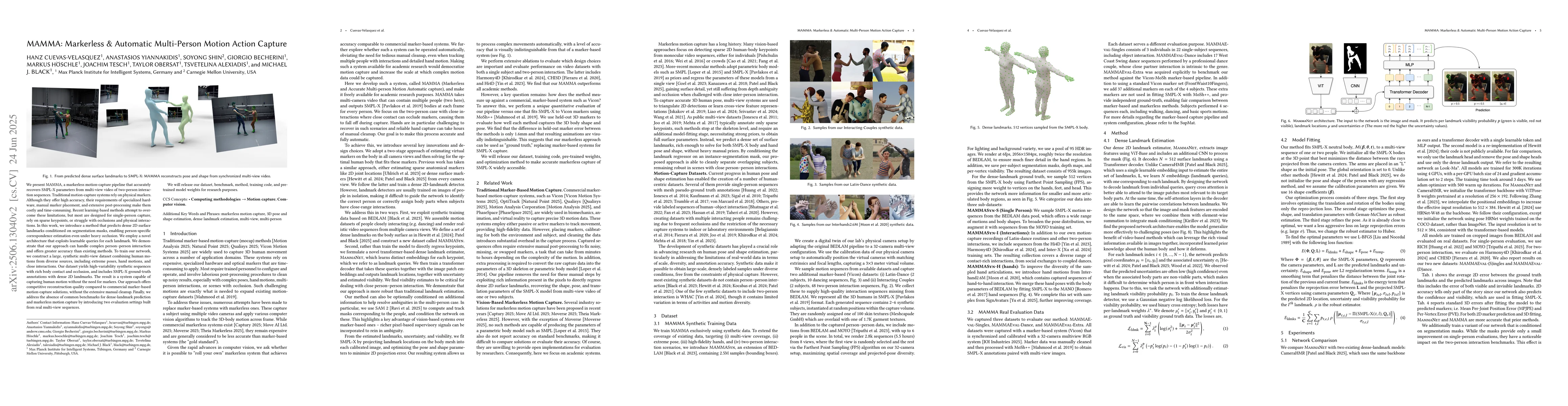 We present MAMMA, a markerless motion-capture pipeline that accurately recovers SMPL-X parameters from multi-view video of two-person interaction sequences. Traditional motion-capture systems rely on physical markers. Although they offer high accuracy, their requirements of specialized hardware, manual marker placement, and extensive post-processing make them costly and time-consuming. Recent learning-based methods attempt to overcome these limitations, but most are designed for single-person capture, rely on sparse keypoints, or struggle with occlusions and physical interactions. In this work, we introduce a method that predicts dense 2D surface landmarks conditioned on segmentation masks, enabling person-specific correspondence estimation even under heavy occlusion. We employ a novel architecture that exploits learnable queries for each landmark. We demonstrate that our approach can handle complex person--person interaction and offers greater accuracy than existing methods. To train our network, we construct a large, synthetic multi-view dataset combining human motions from diverse sources, including extreme poses, hand motions, and close interactions. Our dataset yields high-variability synthetic sequences with rich body contact and occlusion, and includes SMPL-X ground-truth annotations with dense 2D landmarks. The result is a system capable of capturing human motion without the need for markers. Our approach offers competitive reconstruction quality compared to commercial marker-based motion-capture solutions, without the extensive manual cleanup. Finally, we address the absence of common benchmarks for dense-landmark prediction and markerless motion capture by introducing two evaluation settings built from real multi-view sequences. We will release our dataset, benchmark, method, training code, and pre-trained model weights for research purposes.
