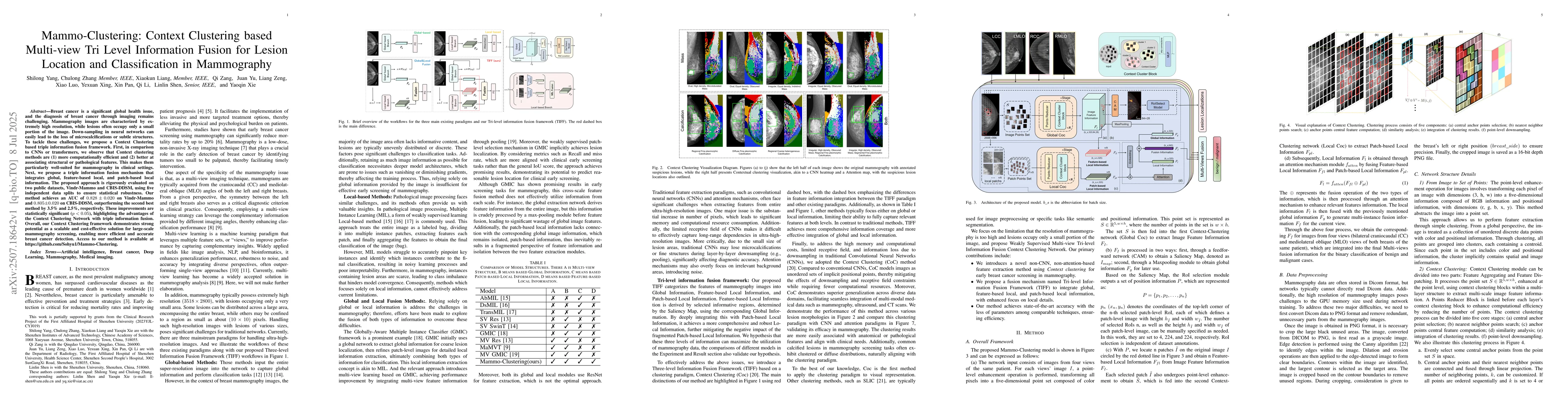 Breast cancer is a significant global health issue, and the diagnosis of breast cancer through imaging remains challenging. Mammography images are characterized by extremely high resolution, while lesions often occupy only a small portion of the image. Down-sampling in neural networks can easily lead to the loss of microcalcifications or subtle structures. To tackle these challenges, we propose a Context Clustering based triple information fusion framework. First, in comparison to CNNs or transformers, we observe that Context clustering methods are (1) more computationally efficient and (2) better at associating structural or pathological features. This makes them particularly well-suited for mammography in clinical settings. Next, we propose a triple information fusion mechanism that integrates global, feature-based local, and patch-based local information. The proposed approach is rigorously evaluated on two public datasets, Vindr-Mammo and CBIS-DDSM, using five independent data splits to ensure statistical robustness. Our method achieves an AUC of 0.828 \pm 0.020 on Vindr-Mammo and 0.805 \pm 0.020 on CBIS-DDSM, outperforming the second best method by 3.5% and 2.5%, respectively. These improvements are statistically significant (p<0.05), highlighting the advantages of the Context Clustering Network with triple information fusion. Overall, our Context Clustering framework demonstrates strong potential as a scalable and cost-effective solution for large-scale mammography screening, enabling more efficient and accurate breast cancer detection. Access to our method is available at https://github.com/Sohyu1/Mammo-Clustering.