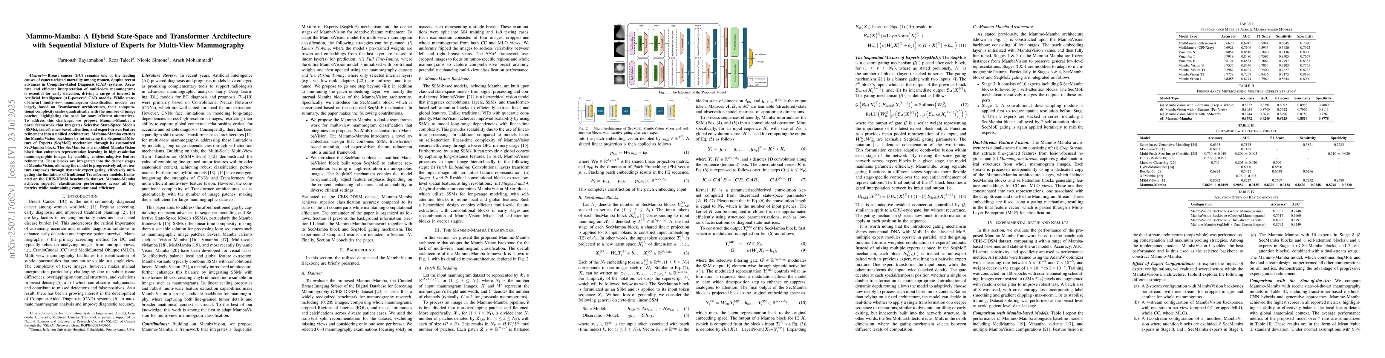 Breast cancer (BC) remains one of the leading causes of cancer-related mortality among women, despite recent advances in Computer-Aided Diagnosis (CAD) systems. Accurate and efficient interpretation of multi-view mammograms is essential for early detection, driving a surge of interest in Artificial Intelligence (AI)-powered CAD models. While state-of-the-art multi-view mammogram classification models are largely based on Transformer architectures, their computational complexity scales quadratically with the number of image patches, highlighting the need for more efficient alternatives. To address this challenge, we propose Mammo-Mamba, a novel framework that integrates Selective State-Space Models (SSMs), transformer-based attention, and expert-driven feature refinement into a unified architecture. Mammo-Mamba extends the MambaVision backbone by introducing the Sequential Mixture of Experts (SeqMoE) mechanism through its customized SecMamba block. The SecMamba is a modified MambaVision block that enhances representation learning in high-resolution mammographic images by enabling content-adaptive feature refinement. These blocks are integrated into the deeper stages of MambaVision, allowing the model to progressively adjust feature emphasis through dynamic expert gating, effectively mitigating the limitations of traditional Transformer models. Evaluated on the CBIS-DDSM benchmark dataset, Mammo-Mamba achieves superior classification performance across all key metrics while maintaining computational efficiency.