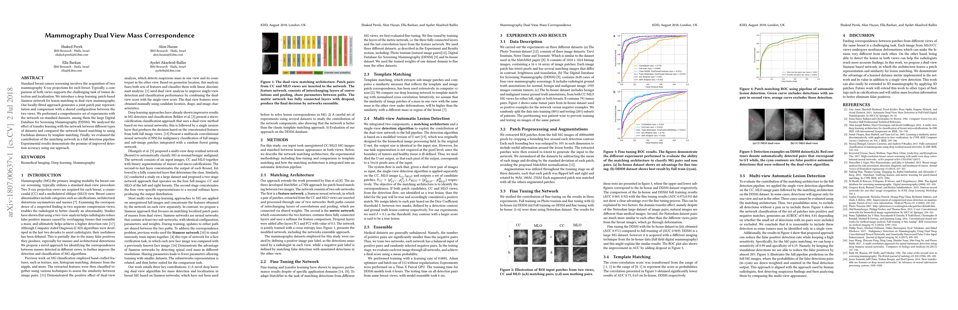 Standard breast cancer screening involves the acquisition of two mammography X-ray projections for each breast. Typically, a comparison of both views supports the challenging task of tumor detection and localization. We introduce a deep learning, patch-based Siamese network for lesion matching in dual-view mammography. Our locally-fitted approach generates a joint patch pair representation and comparison with a shared configuration between the two views. We performed a comprehensive set of experiments with the network on standard datasets, among them the large Digital Database for Screening Mammography (DDSM). We analyzed the effect of transfer learning with the network between different types of datasets and compared the network-based matching to using Euclidean distance by template matching. Finally, we evaluated the contribution of the matching network in a full detection pipeline. Experimental results demonstrate the promise of improved detection accuracy using our approach.
