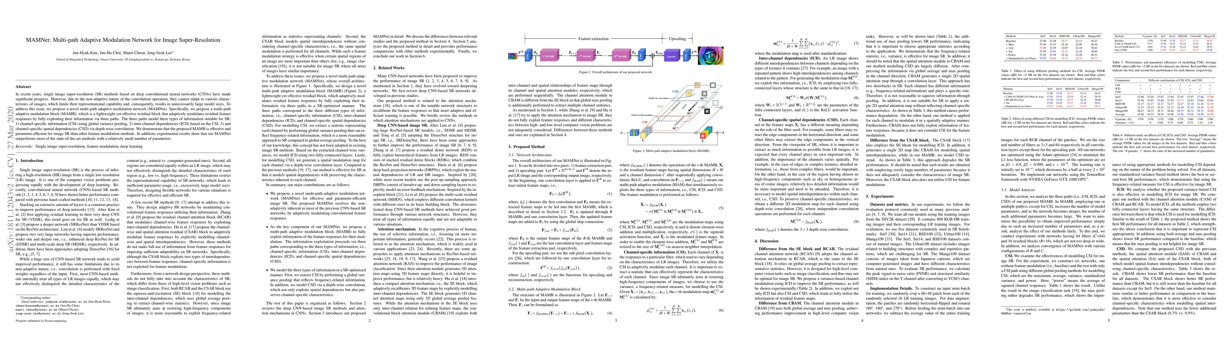 MAMNet introduces a novel multi-path adaptive modulation block (MAMB) for image super-resolution, which adaptively modulates residual features through three paths to enhance representational capability and reduce model size. Experimental results show it outperforms state-of-the-art methods with fewer parameters.