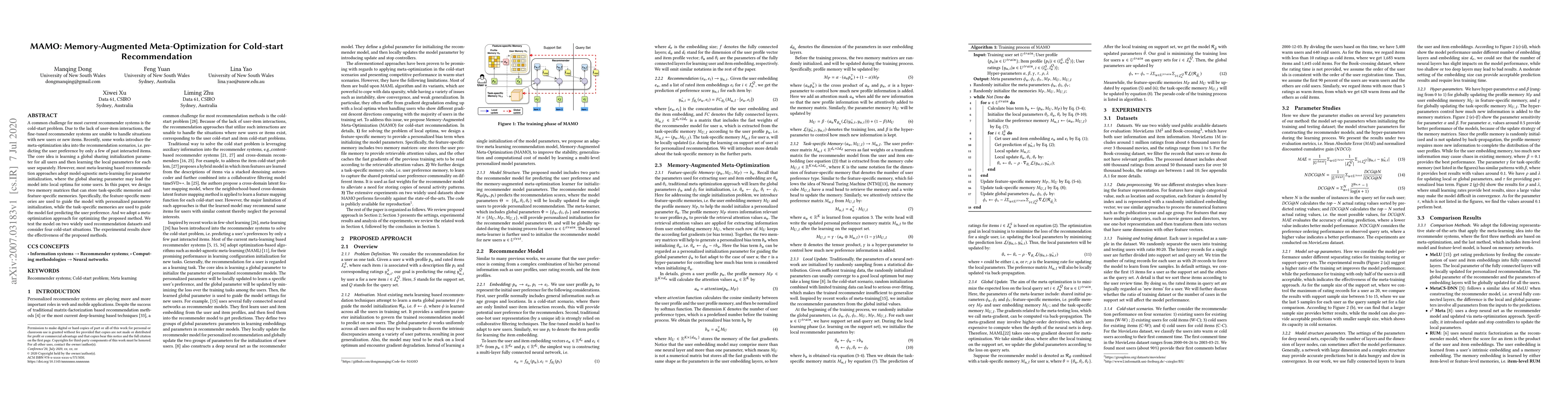 This paper proposes a new method called MAMO to address the cold-start problem in recommender systems, using memory matrices to guide personalized parameter initialization and fast predicting user preferences.
