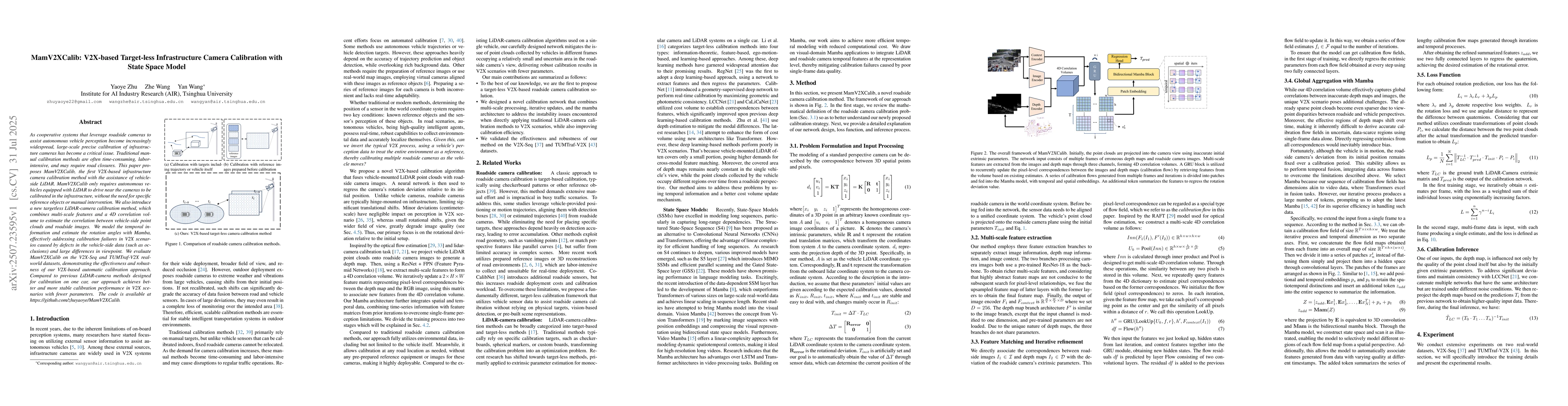 As cooperative systems that leverage roadside cameras to assist autonomous vehicle perception become increasingly widespread, large-scale precise calibration of infrastructure cameras has become a critical issue. Traditional manual calibration methods are often time-consuming, labor-intensive, and may require road closures. This paper proposes MamV2XCalib, the first V2X-based infrastructure camera calibration method with the assistance of vehicle-side LiDAR. MamV2XCalib only requires autonomous vehicles equipped with LiDAR to drive near the cameras to be calibrated in the infrastructure, without the need for specific reference objects or manual intervention. We also introduce a new targetless LiDAR-camera calibration method, which combines multi-scale features and a 4D correlation volume to estimate the correlation between vehicle-side point clouds and roadside images. We model the temporal information and estimate the rotation angles with Mamba, effectively addressing calibration failures in V2X scenarios caused by defects in the vehicle-side data (such as occlusions) and large differences in viewpoint. We evaluate MamV2XCalib on the V2X-Seq and TUMTraf-V2X real-world datasets, demonstrating the effectiveness and robustness of our V2X-based automatic calibration approach. Compared to previous LiDAR-camera methods designed for calibration on one car, our approach achieves better and more stable calibration performance in V2X scenarios with fewer parameters. The code is available at https://github.com/zhuyaoye/MamV2XCalib.