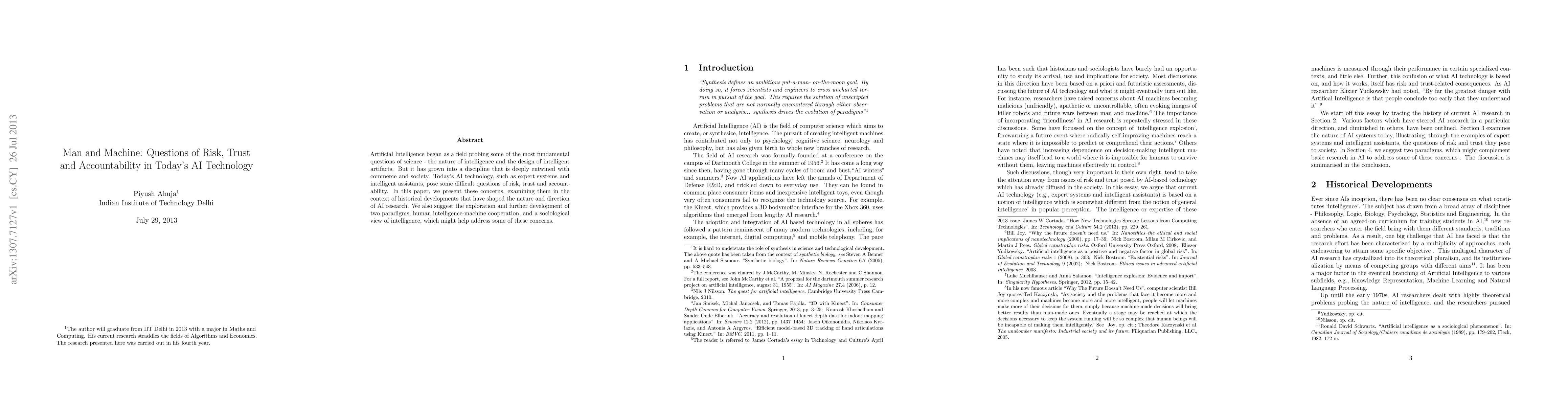 Artificial Intelligence began as a field probing some of the most fundamental questions of science - the nature of intelligence and the design of intelligent artifacts. But it has grown into a discipline that is deeply entwined with commerce and society. Today's AI technology, such as expert systems and intelligent assistants, pose some difficult questions of risk, trust and accountability. In this paper, we present these concerns, examining them in the context of historical developments that have shaped the nature and direction of AI research. We also suggest the exploration and further development of two paradigms, human intelligence-machine cooperation, and a sociological view of intelligence, which might help address some of these concerns.