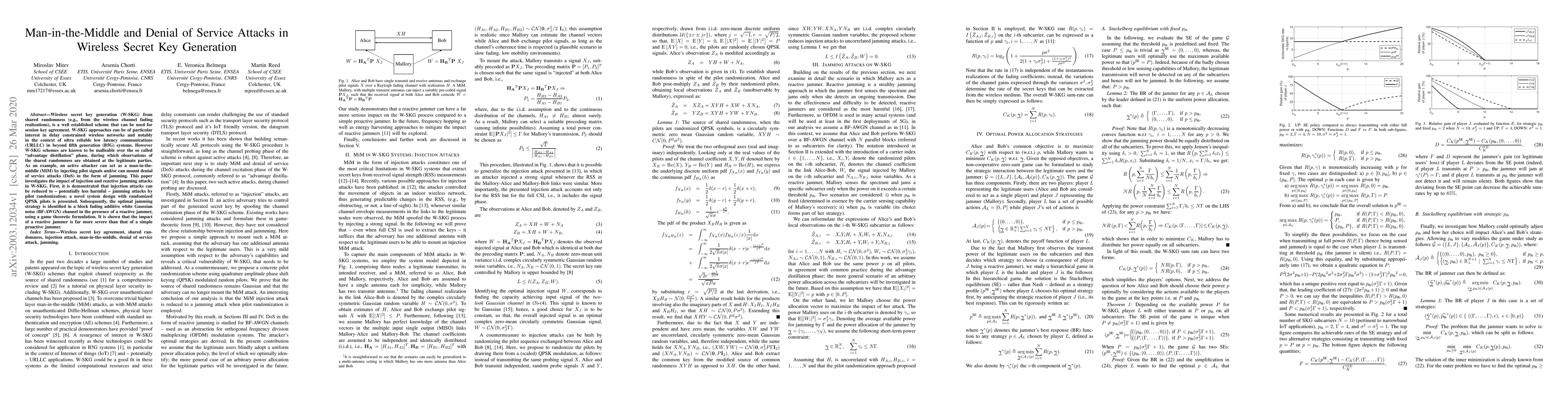 This paper explores man-in-the-middle and denial of service attacks in wireless secret key generation (W-SKG), demonstrating that pilot randomization can mitigate injection attacks. It also identifies the optimal jamming strategy in a block fading channel, showing that reactive jamming is more detrimental than proactive jamming.