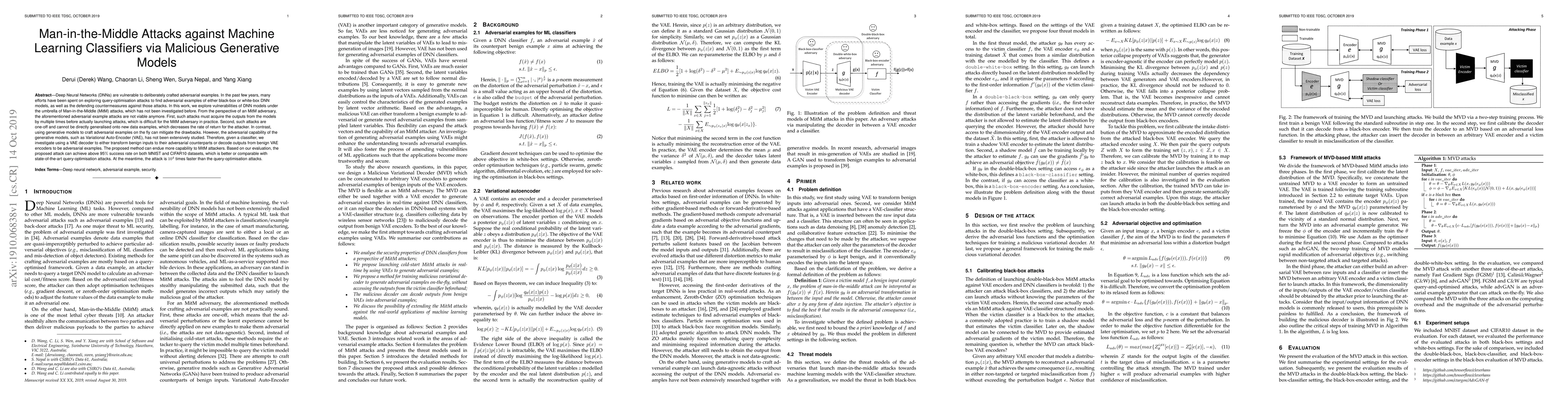 This paper explores Man-in-the-Middle (MitM) attacks against Deep Neural Networks using malicious generative models, specifically Variational Auto-Encoders (VAEs). The proposed attack method can generate adversarial examples on the fly, achieving over 95% success rate on MNIST and CIFAR10 datasets, and is significantly faster than query-optimisation attacks.