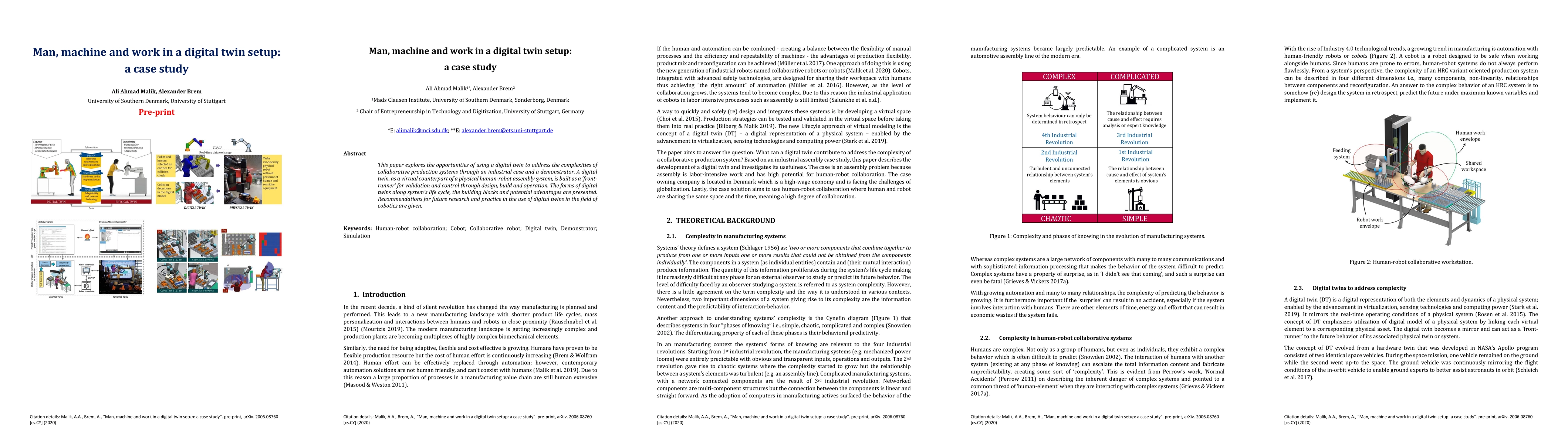 This paper explores the opportunities of using a digital twin to address the complexities of collaborative production systems through an industrial case and a demonstrator. A digital twin, as a virtual counterpart of a physical human-robot assembly system, is built as a front-runner for validation and control through design, build, and operation. The forms of digital twins along the system life cycle, the building blocks, and potential advantages are presented. Recommendations for future research and practice in the use of digital twins in the field of collaborative robots are given.