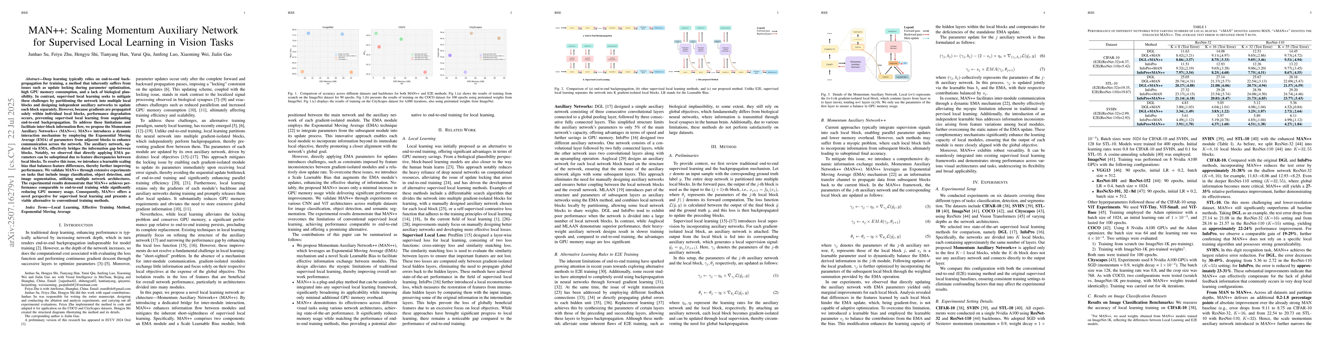 Deep learning typically relies on end-to-end backpropagation for training, a method that inherently suffers from issues such as update locking during parameter optimization, high GPU memory consumption, and a lack of biological plausibility. In contrast, supervised local learning seeks to mitigate these challenges by partitioning the network into multiple local blocks and designing independent auxiliary networks to update each block separately. However, because gradients are propagated solely within individual local blocks, performance degradation occurs, preventing supervised local learning from supplanting end-to-end backpropagation. To address these limitations and facilitate inter-block information flow, we propose the Momentum Auxiliary Network++ (MAN++). MAN++ introduces a dynamic interaction mechanism by employing the Exponential Moving Average (EMA) of parameters from adjacent blocks to enhance communication across the network. The auxiliary network, updated via EMA, effectively bridges the information gap between blocks. Notably, we observed that directly applying EMA parameters can be suboptimal due to feature discrepancies between local blocks. To resolve this issue, we introduce a learnable scaling bias that balances feature differences, thereby further improving performance. We validate MAN++ through extensive experiments on tasks that include image classification, object detection, and image segmentation, utilizing multiple network architectures. The experimental results demonstrate that MAN++ achieves performance comparable to end-to-end training while significantly reducing GPU memory usage. Consequently, MAN++ offers a novel perspective for supervised local learning and presents a viable alternative to conventional training methods.