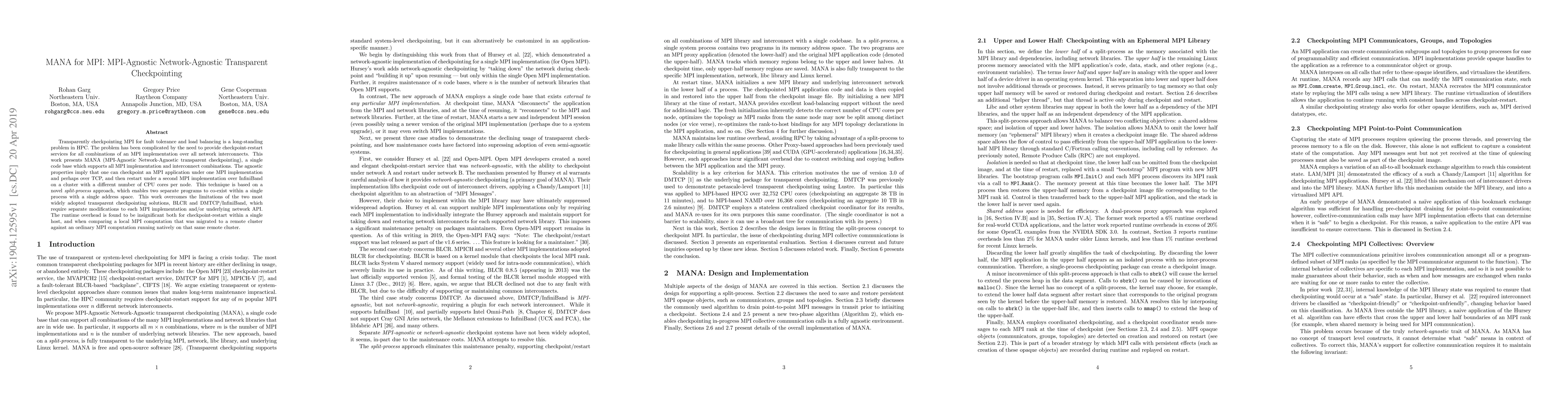 MANA provides a single, MPI-agnostic and network-agnostic transparent checkpointing solution for high-performance computing, enabling checkpoint-restart across different MPI implementations and network interconnects with minimal runtime overhead. This is achieved through a novel "split-process" approach, overcoming the limitations of existing solutions like BLCR and DMTCP/InfiniBand.