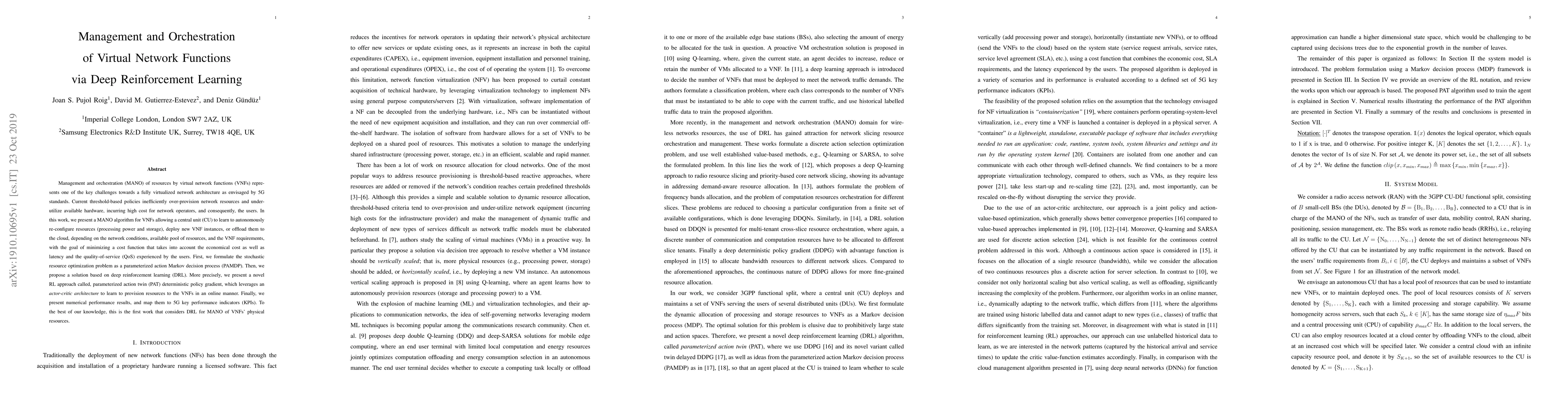 Management and orchestration (MANO) of resources by virtual network functions (VNFs) represents one of the key challenges towards a fully virtualized network architecture as envisaged by 5G standards. Current threshold-based policies inefficiently over-provision network resources and under-utilize available hardware, incurring high cost for network operators, and consequently, the users. In this work, we present a MANO algorithm for VNFs allowing a central unit (CU) to learn to autonomously re-configure resources (processing power and storage), deploy new VNF instances, or offload them to the cloud, depending on the network conditions, available pool of resources, and the VNF requirements, with the goal of minimizing a cost function that takes into account the economical cost as well as latency and the quality-of-service (QoS) experienced by the users. First, we formulate the stochastic resource optimization problem as a parameterized action Markov decision process (PAMDP). Then, we propose a solution based on deep reinforcement learning (DRL). More precisely, we present a novel RL approach called, parameterized action twin (PAT) deterministic policy gradient, which leverages an actor-critic architecture to learn to provision resources to the VNFs in an online manner. Finally, we present numerical performance results, and map them to 5G key performance indicators (KPIs). To the best of our knowledge, this is the first work that considers DRL for MANO of VNFs' physical resources.