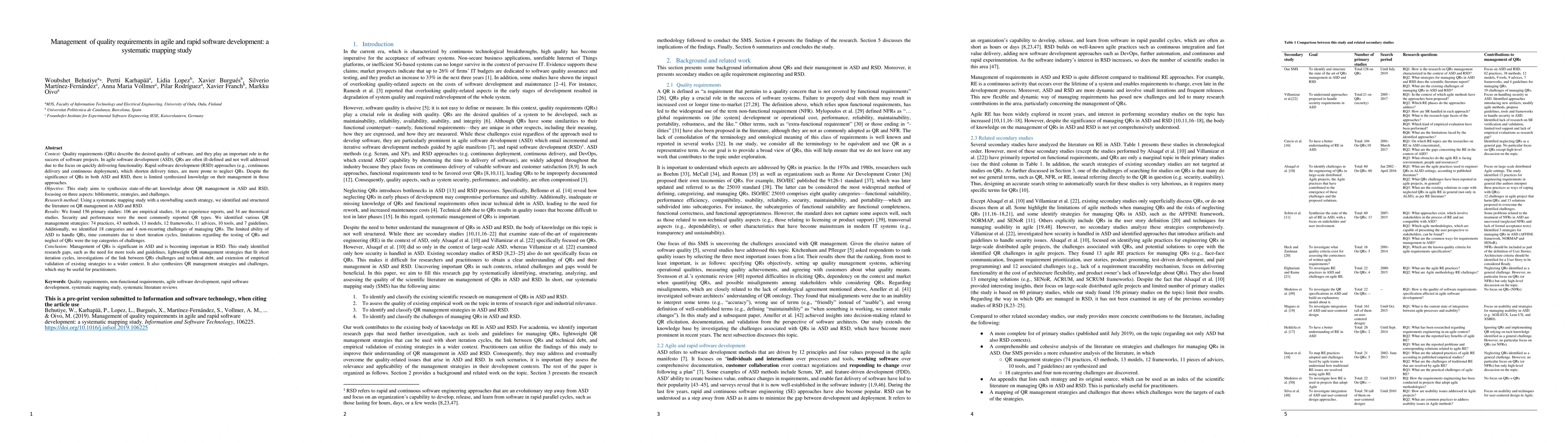 Context:Quality requirements (QRs) describe the desired quality of software, and they play an important role in the success of software projects. In agile software development (ASD), QRs are often ill-defined and not well addressed due to the focus on quickly delivering functionality. Rapid software development (RSD) approaches (e.g., continuous delivery and continuous deployment), which shorten delivery times, are more prone to neglect QRs. Despite the significance of QRs in both ASD and RSD, there is limited synthesized knowledge on their management in those approaches. Objective:This study aims to synthesize state-of-the-art knowledge about QR management in ASD and RSD, focusing on three aspects: bibliometric, strategies, and challenges. Research method:Using a systematic mapping study with a snowballing search strategy, we identified and structured the literature on QR management in ASD and RSD. Check the PDF file to see the full abstract and document.