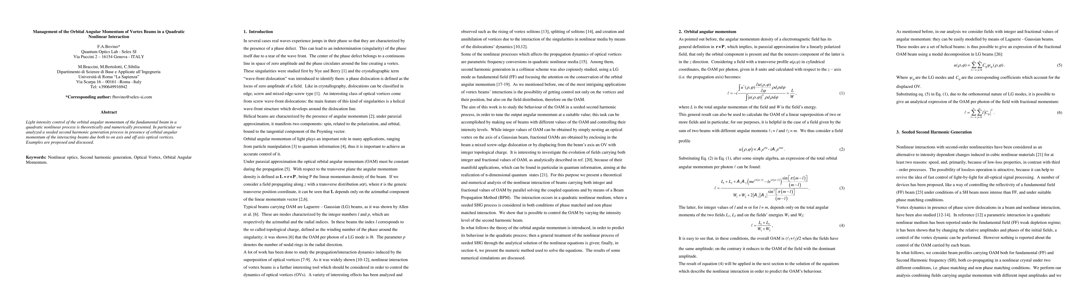 Light intensity control of the orbital angular momentum of the fundamental beam in a quadratic nonlinear process is theoretically and numerically presented. In particular we analyzed a seeded second harmonic generation process in presence of orbital angular momentum of the interacting beams due both to on axis and off axis optical vortices. Examples are proposed and discussed.