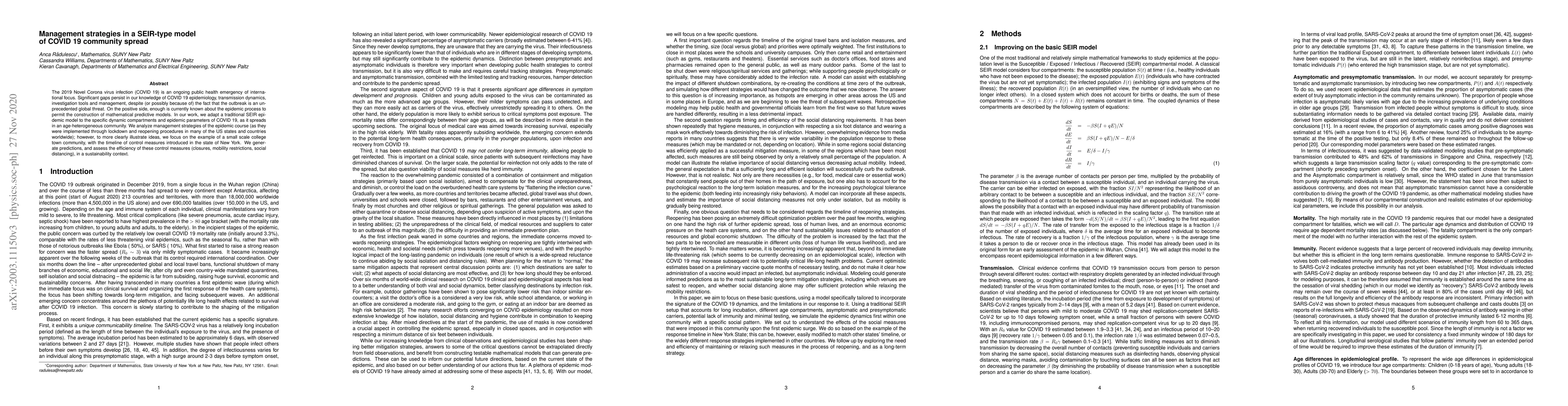 The 2019 Novel Corona virus infection (COVID 19) is an ongoing public health emergency of international focus. Significant gaps persist in our knowledge of COVID 19 epidemiology, transmission dynamics, investigation tools and management, despite (or possibly because of) the fact that the outbreak is an unprecedented global threat. On the positive side, enough is currently known about the epidemic process to permit the construction of mathematical predictive models. In our work, we adapt a traditional SEIR epidemic model to the specific dynamic compartments and epidemic parameters of COVID 19, as it spreads in an age-heterogeneous community. We analyze management strategies of the epidemic course (as they were implemented through lockdown and reopening procedures in many of the US states and countries worldwide); however, to more clearly illustrate ideas, we focus on the example of a small scale college town community, with the timeline of control measures introduced in the state of New York. We generate predictions, and assess the efficiency of these control measures (closures, mobility restrictions, social distancing), in a sustainability context.