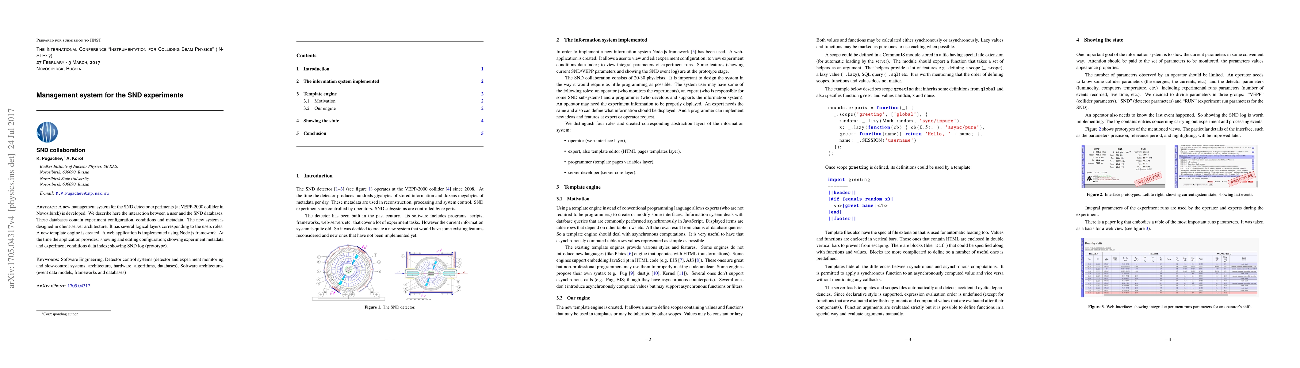 The paper presents a new management system for SND detector experiments at the VEPP-2000 collider, featuring a client-server architecture with multiple user roles and a Node.js web application for configuration, metadata, and log management. The system includes a new template engine and provides functionalities for viewing and editing experiment settings and conditions.