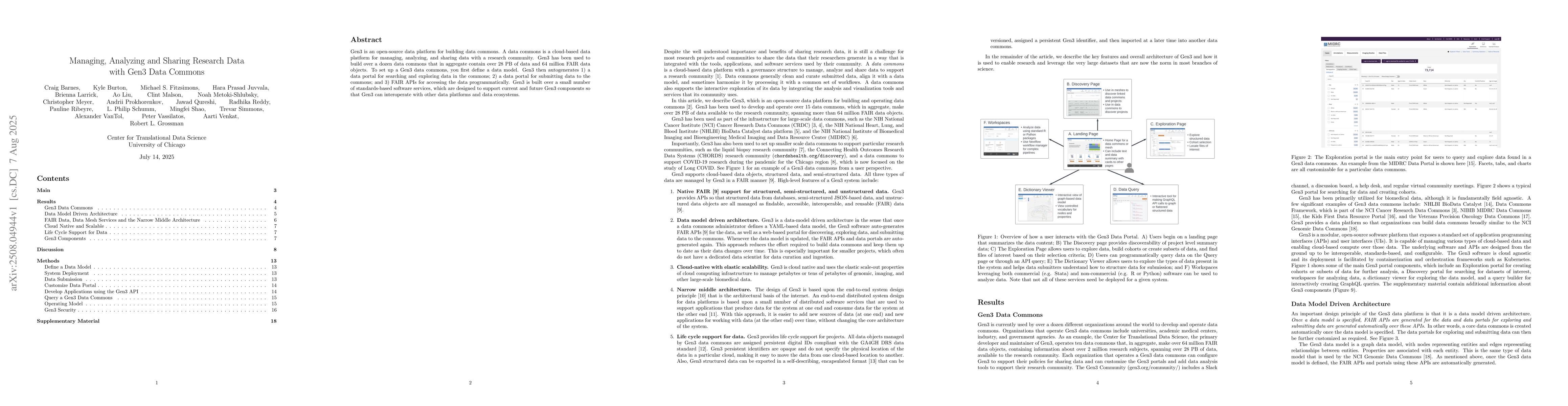 Gen3 is an open-source data platform for building data commons. A data commons is a cloud-based data platform for managing, analyzing, and sharing data with a research community. Gen3 has been used to build over a dozen data commons that in aggregate contain over 28 PB of data and 64 million FAIR data objects. To set up a Gen3 data commons, you first define a data model. Gen3 then autogenerates 1) a data portal for searching and exploring data in the commons; 2) a data portal for submitting data to the commons; and 3) FAIR APIs for accessing the data programmatically. Gen3 is built over a small number of standards-based software services, which are designed to support current and future Gen3 components so that Gen3 can interoperate with other data platforms and data ecosystems.