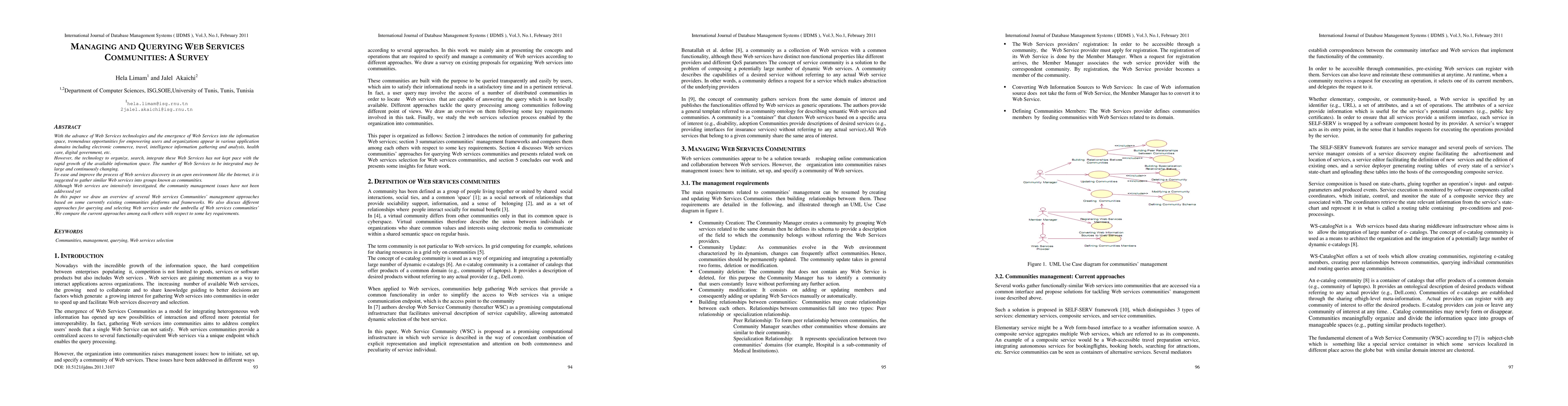 With the advance of Web Services technologies and the emergence of Web Services into the information space, tremendous opportunities for empowering users and organizations appear in various application domains including electronic commerce, travel, intelligence information gathering and analysis, health care, digital government, etc. However, the technology to organize, search, integrate these Web Services has not kept pace with the rapid growth of the available information space. The number of Web Services to be integrated may be large and continuously changing. To ease and improve the process of Web services discovery in an open environment like the Internet, it is suggested to gather similar Web services into groups known as communities. Although Web services are intensively investigated, the community management issues have not been addressed yet In this paper we draw an overview of several Web services Communities' management approaches based on some currently existing communities platforms and frameworks. We also discuss different approaches for querying and selecting Web services under the umbrella of Web services communities'. We compare the current approaches among each others with respect to some key requirements.