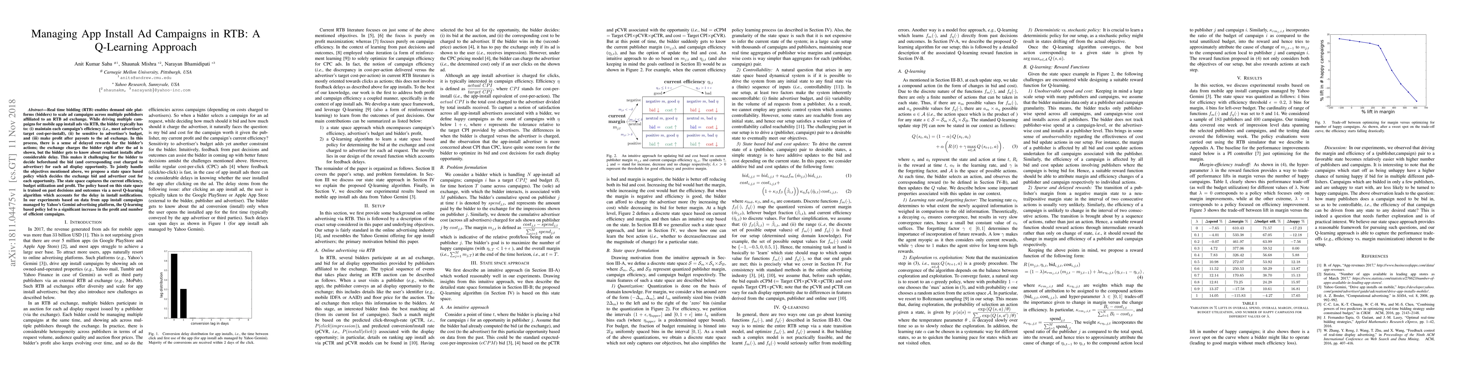 This paper proposes a Q-learning approach to manage app install ad campaigns in real-time bidding (RTB) environments, balancing campaign efficiency, budget sensitivity, and profit. The developed state-space policy, trained on historical data, significantly boosts profit and campaign efficiency, as demonstrated through experiments on Yahoo's Gemini platform.