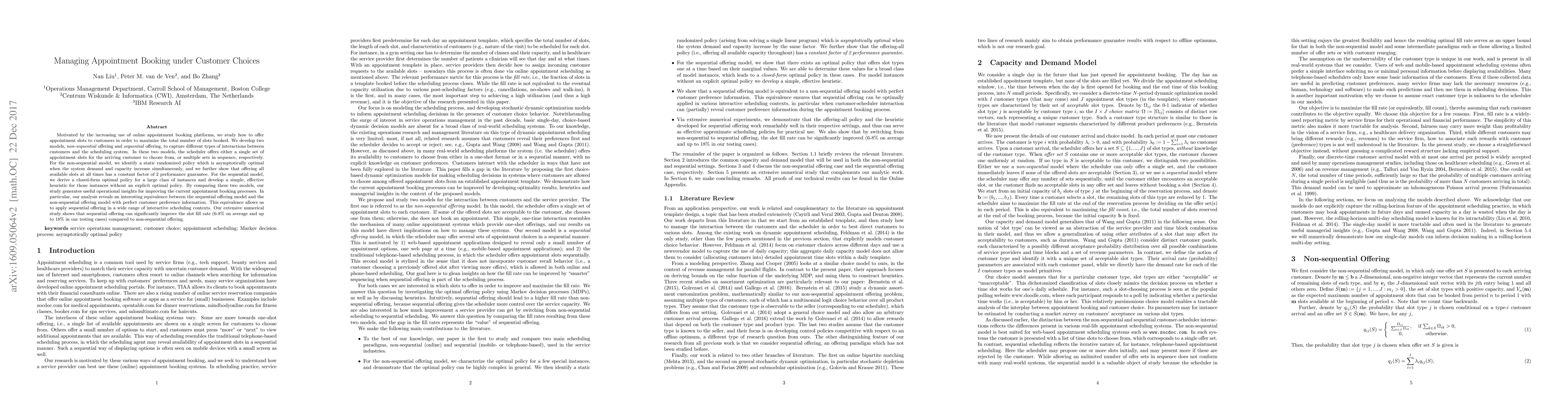 Motivated by the increasing use of online appointment booking platforms, we study how to offer appointment slots to customers in order to maximize the total number of slots booked. We develop two models, non-sequential offering and sequential offering, to capture different types of interactions between customers and the scheduling system. In these two models, the scheduler offers either a single set of appointment slots for the arriving customer to choose from, or multiple sets in sequence, respectively. For the non-sequential model, we identify a static randomized policy which is asymptotically optimal when the system demand and capacity increase simultaneously, and we further show that offering all available slots at all times has a constant factor of 2 performance guarantee. For the sequential model, we derive a closed-form optimal policy for a large class of instances and develop a simple, effective heuristic for those instances without an explicit optimal policy. By comparing these two models, our study generates useful operational insights for improving the current appointment booking processes. In particular, our analysis reveals an interesting equivalence between the sequential offering model and the non-sequential offering model with perfect customer preference information. This equivalence allows us to apply sequential offering in a wide range of interactive scheduling contexts. Our extensive numerical study shows that sequential offering can significantly improve the slot fill rate (6-8% on average and up to 18% in our testing cases) compared to non-sequential offering.