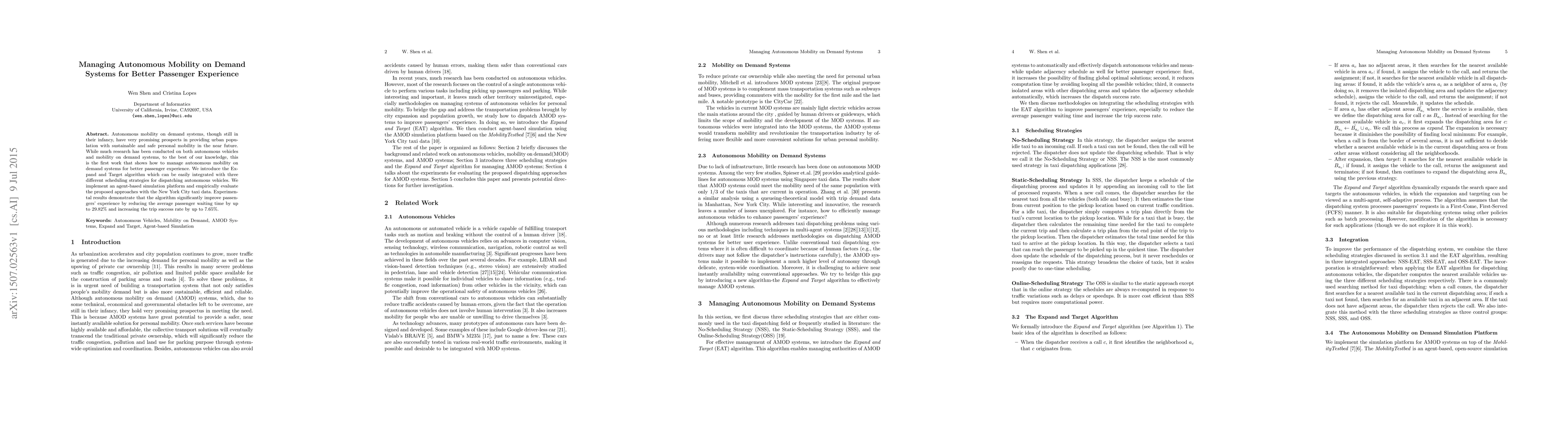Autonomous mobility on demand systems, though still in their infancy, have very promising prospects in providing urban population with sustainable and safe personal mobility in the near future. While much research has been conducted on both autonomous vehicles and mobility on demand systems, to the best of our knowledge, this is the first work that shows how to manage autonomous mobility on demand systems for better passenger experience. We introduce the Expand and Target algorithm which can be easily integrated with three different scheduling strategies for dispatching autonomous vehicles. We implement an agent-based simulation platform and empirically evaluate the proposed approaches with the New York City taxi data. Experimental results demonstrate that the algorithm significantly improve passengers' experience by reducing the average passenger waiting time by up to 29.82% and increasing the trip success rate by up to 7.65%.