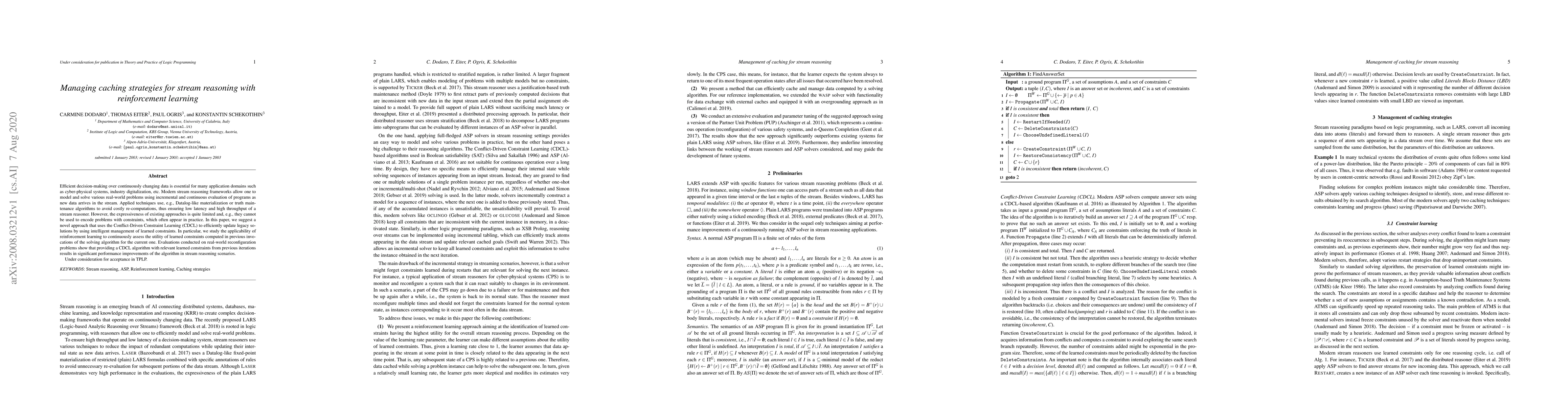 This paper proposes a novel caching strategy using Conflict-Driven Constraint Learning (CDCL) and reinforcement learning to enhance stream reasoning performance. The approach leverages learned constraints from previous iterations to improve the efficiency of solving problems in real-time data streams, demonstrating significant performance gains in reconfiguration tasks.