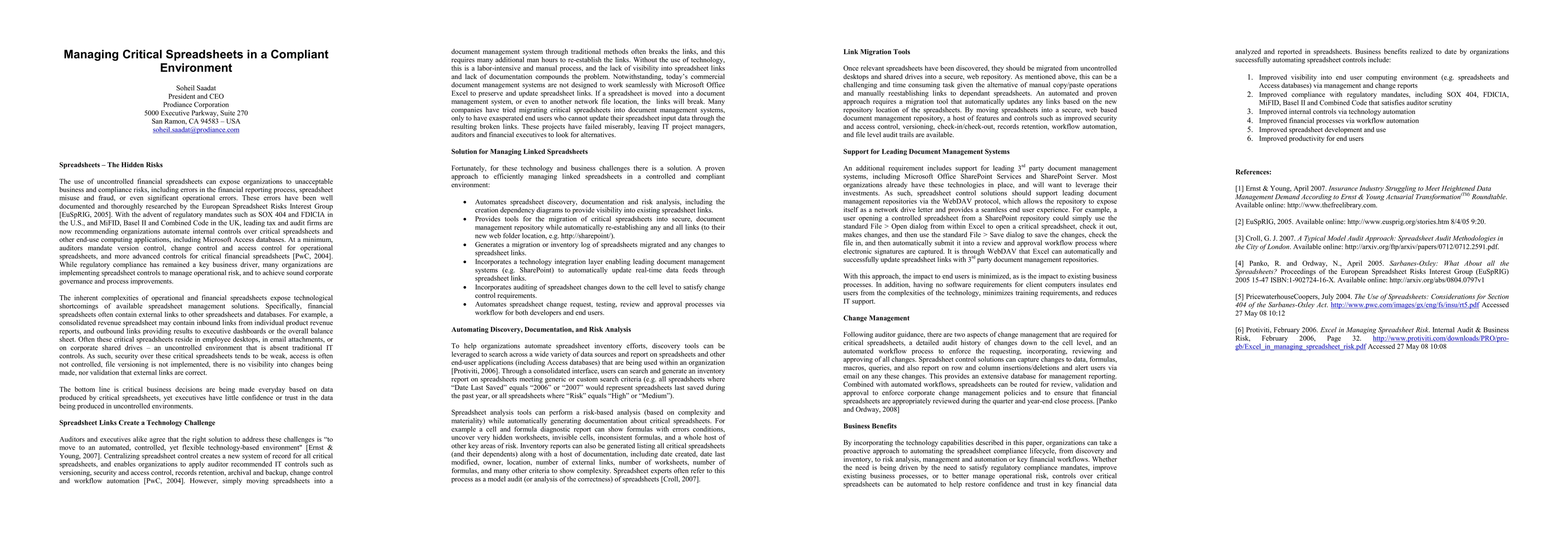 This paper discusses the risks associated with uncontrolled financial spreadsheets and emphasizes the need for automated internal controls, including version, change, and access controls, to comply with regulatory mandates like SOX 404 and MiFID, ensuring accurate financial reporting and mitigating fraud.