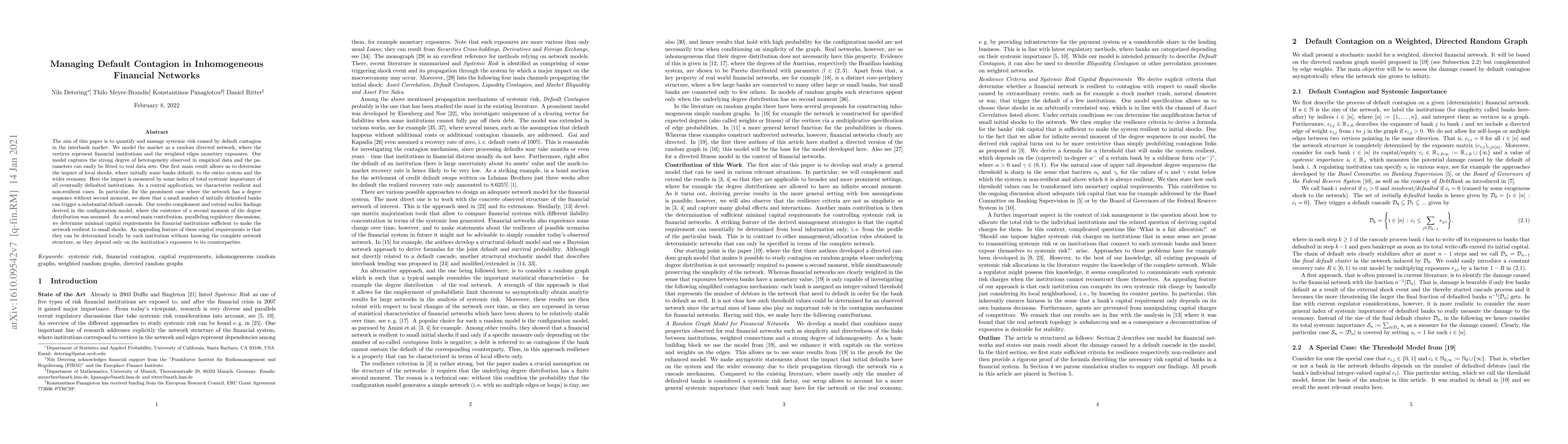 This paper models the interbank market as a heterogeneous directed network to quantify and manage systemic risk from default contagion. It determines the impact of local shocks on the entire financial system and identifies minimal capital requirements to ensure network resilience, showing that even a small number of initial defaults can trigger large cascades in networks lacking a second moment in their degree distribution.