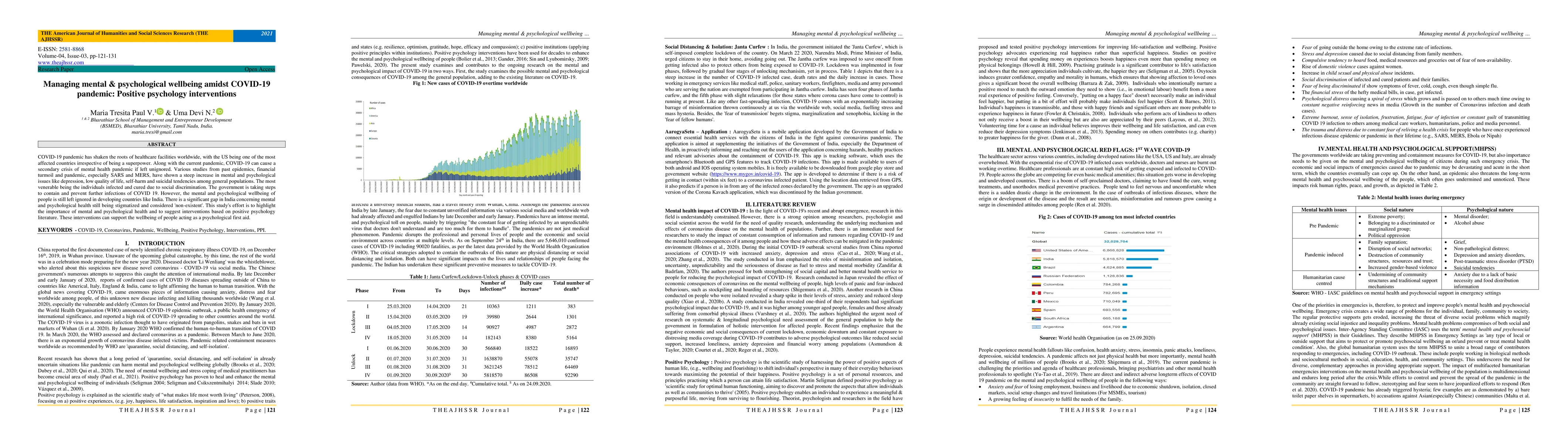 COVID-19 pandemic has shaken the roots of healthcare facilities worldwide, with the US being one of the most affected countries irrespective of being a superpower. Along with the current pandemic, COVID-19 can cause a secondary crisis of mental health pandemic if left unignored. Various studies from past epidemics, financial turmoil and pandemic, especially SARS and MERS, have shown a steep increase in mental and psychological issues like depression, low quality of life, self-harm and suicidal tendencies among general populations. The most venerable being the individuals infected and cured due to social discrimination. The government is taking steps to contain and prevent further infections of COVID-19. However, the mental and psychological wellbeing of people is still left ignored in developing countries like India. There is a significant gap in India concerning mental and psychological health still being stigmatized and considered 'non-existent'. This study's effort is to highlight the importance of mental and psychological health and to suggest interventions based on positive psychology literature. These interventions can support the wellbeing of people acting as a psychological first aid. Keywords: COVID-19, Coronavirus, Pandemic, Mental wellbeing, Psychological Wellbeing, Positive Psychology Interventions. KEYWORDS - COVID-19, Coronavirus, Pandemic, Wellbeing, Positive Psychology, Interventions, PPI.