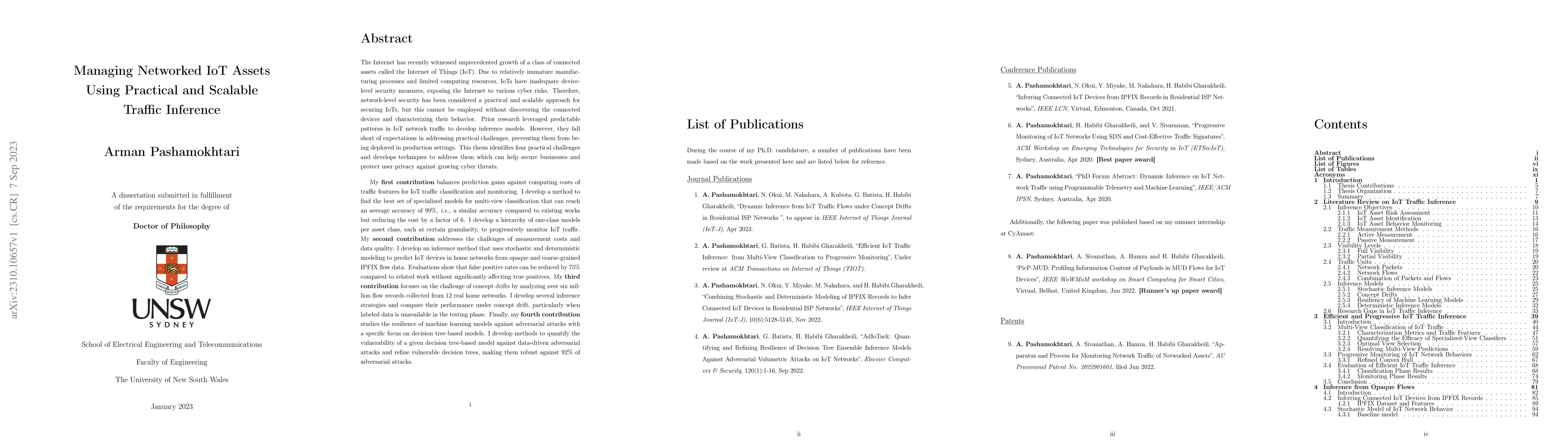 This paper addresses the security challenges of IoT devices by developing scalable traffic inference techniques. It introduces methods for balancing prediction accuracy with computational efficiency, improving data quality, managing concept drifts, and enhancing machine learning model resilience against adversarial attacks.