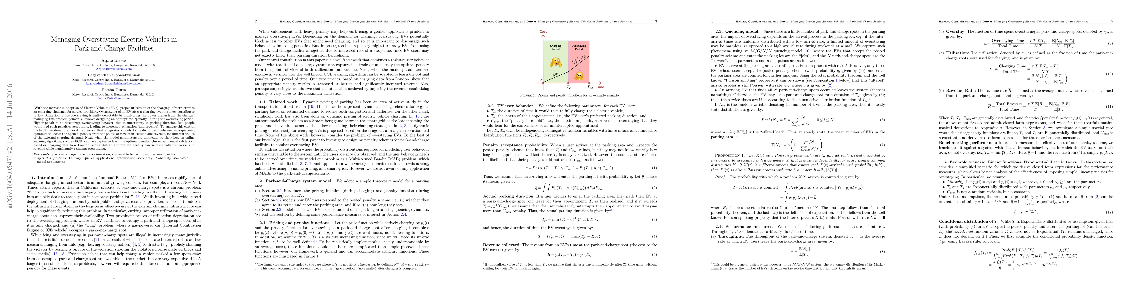 With the increase in adoption of Electric Vehicles (EVs), proper utilization of the charging infrastructure is an emerging challenge for service providers. Overstaying of an EV after a charging event is a key contributor to low utilization. Since overstaying is easily detectable by monitoring the power drawn from the charger, managing this problem primarily involves designing an appropriate "penalty" during the overstaying period. Higher penalties do discourage overstaying; however, due to uncertainty in parking duration, less people would find such penalties acceptable, leading to decreased utilization (and revenue). To analyze this central trade-off, we develop a novel framework that integrates models for realistic user behavior into queueing dynamics to locate the optimal penalty from the points of view of utilization and revenue, for different values of the external charging demand. Next, when the model parameters are unknown, we show how an online learning algorithm, such as UCB, can be adapted to learn the optimal penalty. Our experimental validation, based on charging data from London, shows that an appropriate penalty can increase both utilization and revenue while significantly reducing overstaying.