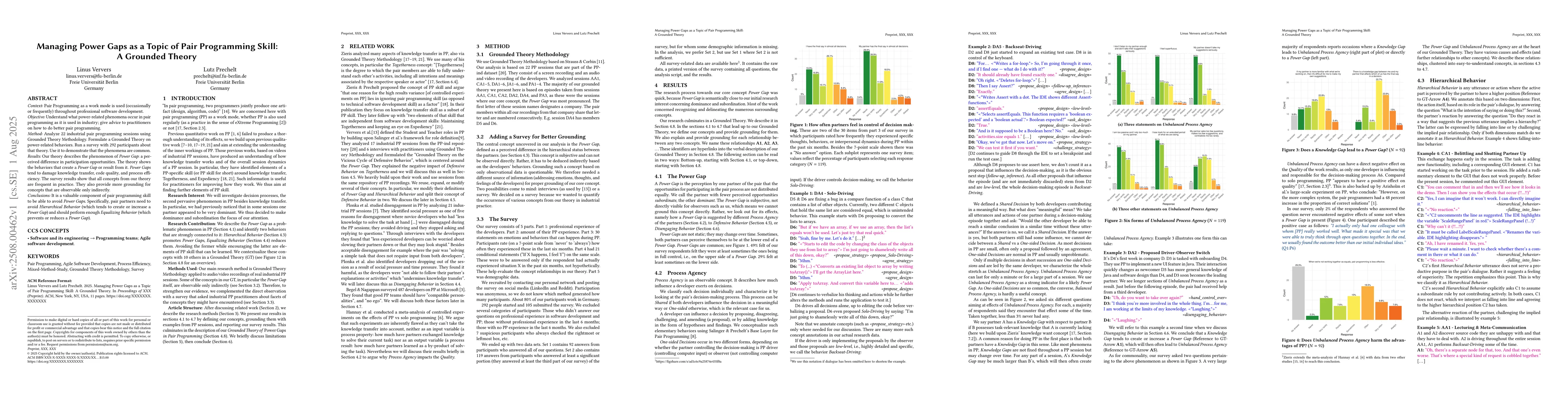 Context: Pair Programming as a work mode is used (occasionally or frequently) throughout professional software development. Objective: Understand what power-related phenomena occur in pair programming as it is used in industry; give advice to practitioners on how to do better pair programming. Method: Analyze 22 industrial pair programming sessions using Grounded Theory Methodology. Formulate a Grounded Theory on power-related behaviors. Run a survey with 292 participants about that theory. Use it to demonstrate that the phenomena are common. Results: Our theory describes the phenomenon of Power Gap: a perceived difference in participation opportunities. The theory shows the behaviors that create a Power Gap or result from it. Power Gaps tend to damage knowledge transfer, code quality, and process effi ciency. The survey results show that all concepts from our theory are frequent in practice. They also provide more grounding for concepts that are observable only indirectly. Conclusions: It is a valuable component of pair programming skill to be able to avoid Power Gaps. Specifically, pair partners need to avoid Hierarchical Behavior (which tends to create or increase a Power Gap) and should perform enough Equalizing Behavior (which prevents or reduces a Power Gap).